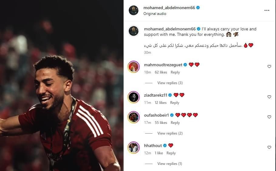 وكتب محمد عبد المنعم في رسالة لجمهور الأهلي عبر موقع التواصل الاجتماعي "انستجرام": "سأحمل دائما حبكم ودعمكم معي، شكرا لكم على كل شيء".