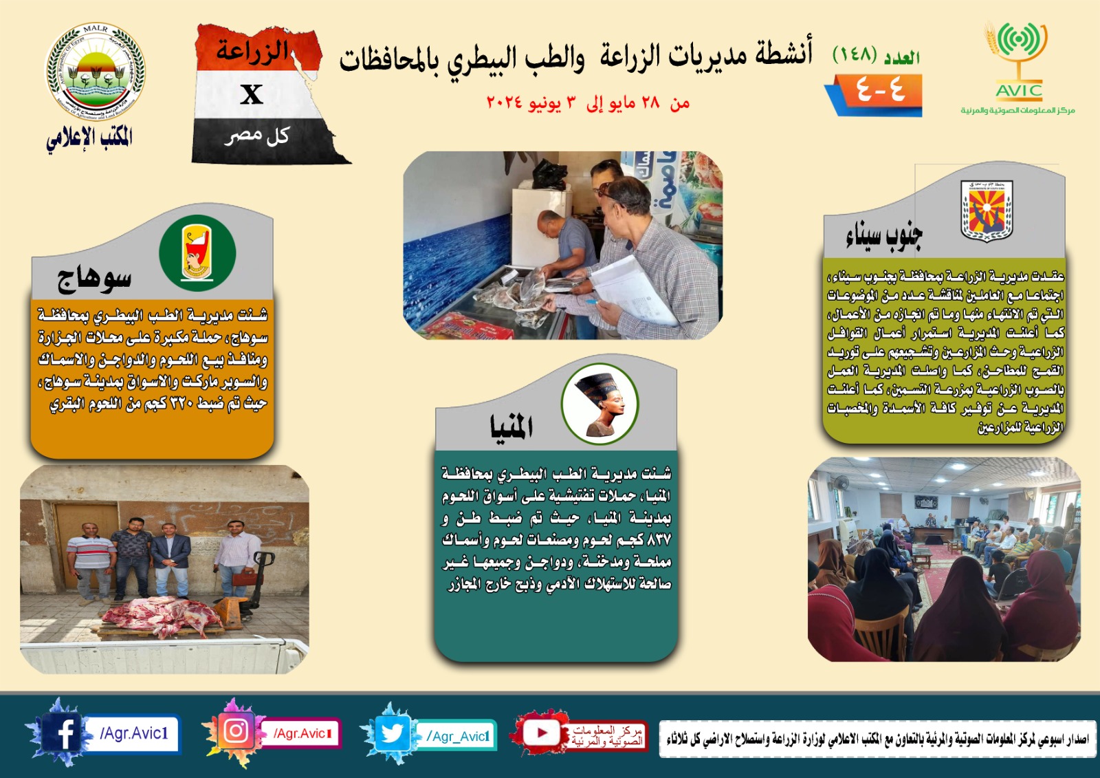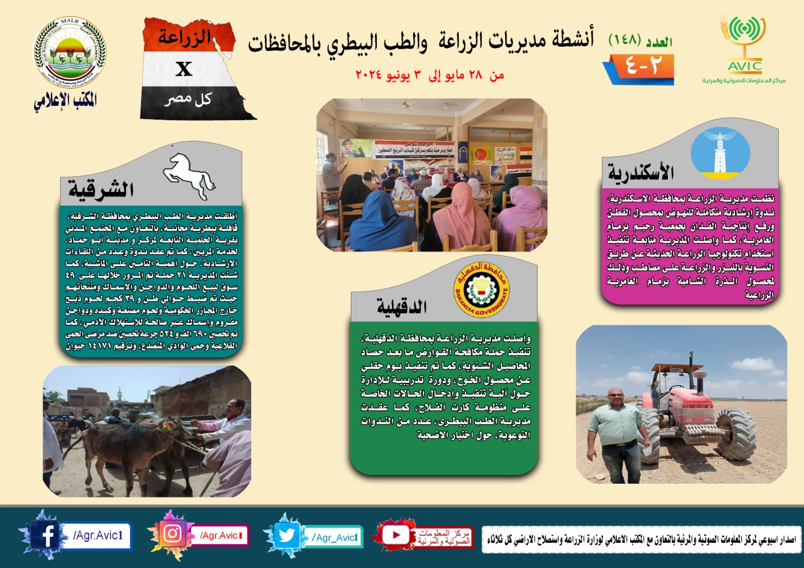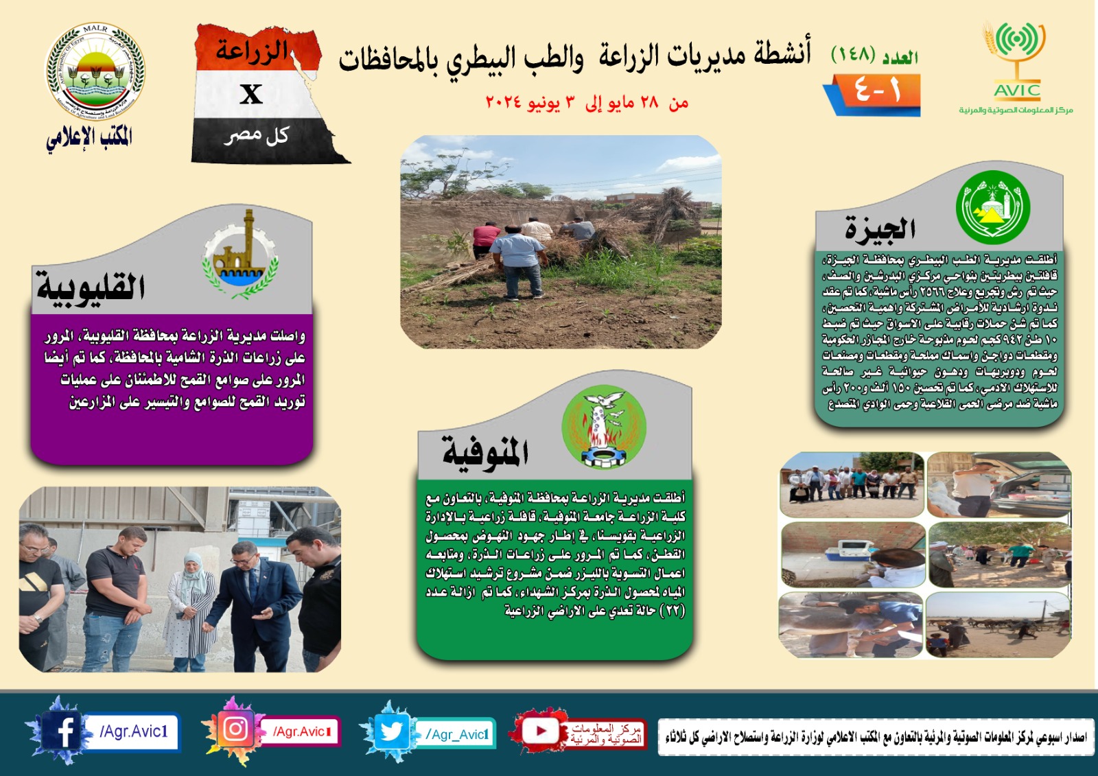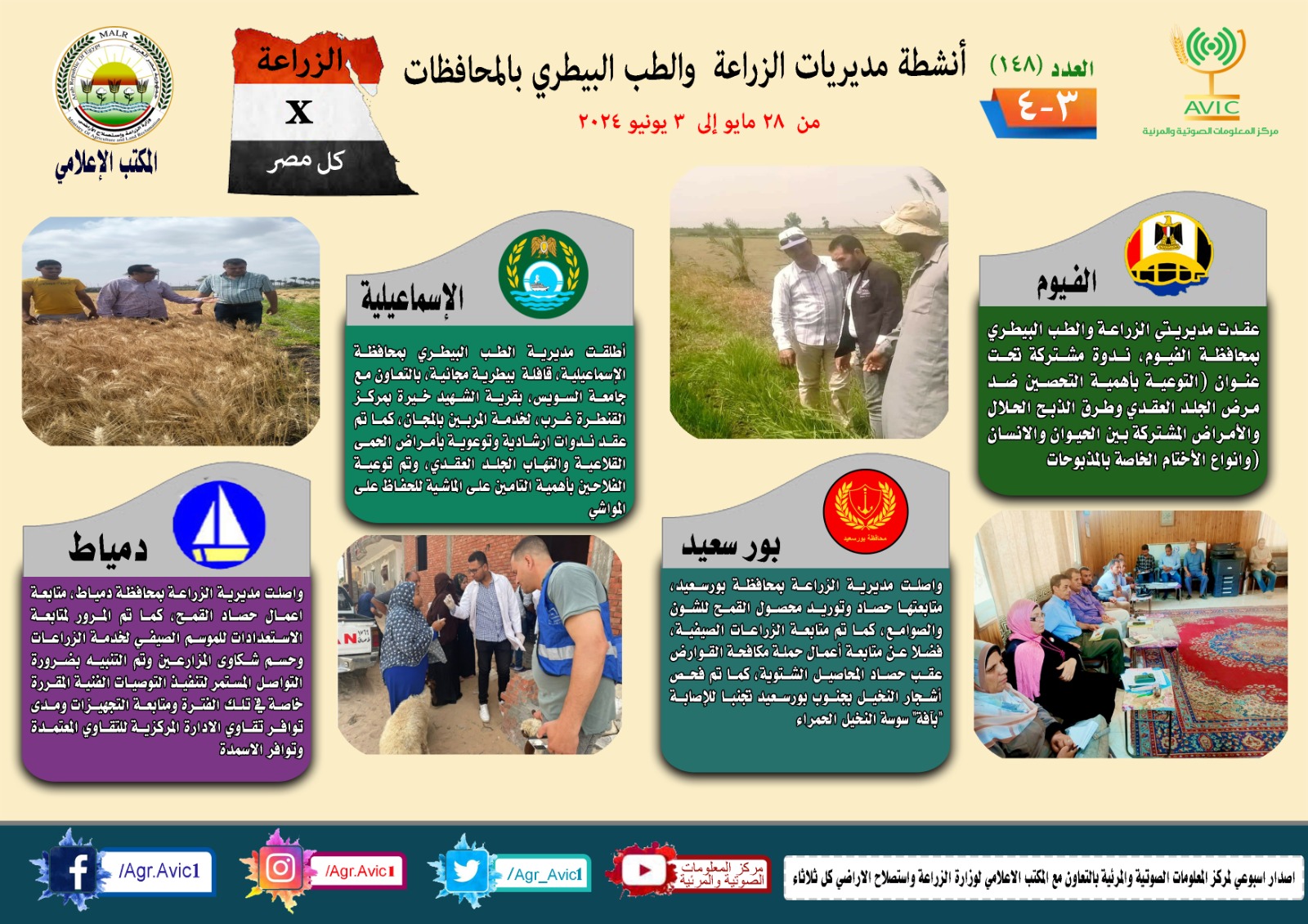 أصدر مركز المعلومات الصوتية والمرئية التابع لوزارة الزراعة واستصلاح الأراضي، والمكتب الاعلامي للوزارة، العدد رقم 148 من إصدار: "الزراعة في كل مصر" بالانفوجراف والفيديو، حيث يوضح الجهود والأنشطة التي تقوم بها مديريات الزراعة والطب البيطري بمحافظات الجمهورية خلال الفترة من 28 مايو وحتى 3 يونيو الجاري.