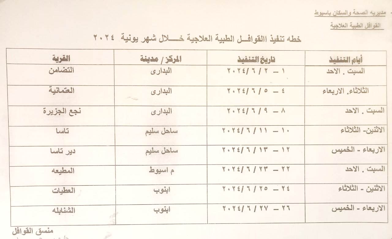 وأوضح محافظ أسيوط أن القوافل العلاجية انطلقت في 1 يونيو الجاري وتستمر لمدة شهر لتقديم خدماتها لمواطني القرى بـ 4 مراكز على مستوى المحافظة لتوفير الرعاية الحية لهم حيث بدأت القوافل بالكشف على مواطني قرية التضامن بمركز البداري يومي السبت والأحد الماضيين 1و2 يونيو بعدها بقرية العتمانية بالبداري يومي الثلاثاء والأربعاء 5 و6 يونيو وتواصل تقديم خدماتها الطبية يومي السبت والأحد 8 و9 يونيو بقرية نجع الجزيرة بالبداري بعدها تتوجه لمركز ساحل سليم لتقدم خدماتها بقرية تاسا يومي الاثنين والثلاثاء 10و11 يونيو ثم قرية دير تاسا يومي الأربعاء والخميس 12و13 يونيو ثم تنتقل القافلة لمركز أسيوط وتقدم الخدمات العلاجية لأهالي قرية المطيعة يومي السبت والأحد 22 و23 يونيو وتختتم القافلة أعمالها بمركز أبنوب يومي الاثنين والثلاثاء 24و25 يونيو بقرية العطيات ثم يومي الأربعاء والخميس 26 و27 يونيو بقرية الشانبلة التابعة لمركز أبنوب.