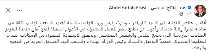 تقدم الرئيس عبد الفتاح السيسي يتقدم بخالص التهنئة لرئيس وزراء الهند بمناسبة تجديد الشعب الهندي الثقة في قيادته لفترة ولاية جديدة.