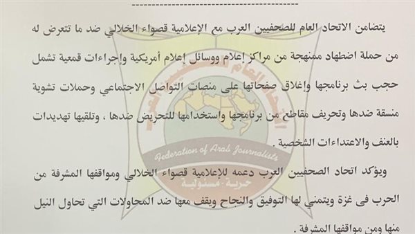وأكد اتحاد الصحفيين العرب دعمه للإعلامية قصواء الخلالي ومواقفها المشرفة من حرية - مسئولية الحرب في غزة متمنيا لها التوفيق والنجاح والوقوف معها ضد المحاولات التي تحاول النيل منها ومن مواقفها المشرفة.