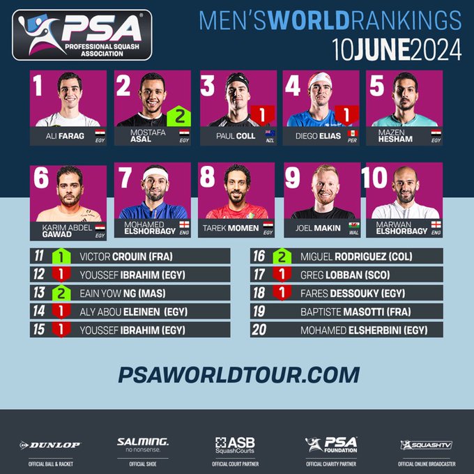 وتقدم البطل المصري مصطفى عسل لاعب النادي الأهلي إلى المركز الثاني ليستقر في وصافة التصنيف، وذلك بعد تتويجه مؤخراً ببطولة بريطانيا للاسكواش.