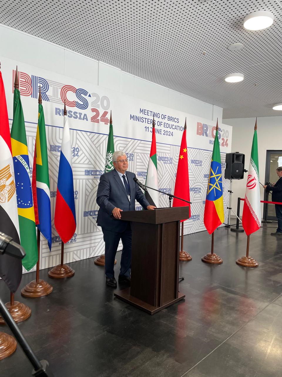 وفي ختام كلمته، أكد الوزير أننا ملتزمون بتوفير بيئة تعليمية محفزة تشجع على الإبداع والابتكار، ونسعى جاهدين لتطوير برامج دراسية متطورة تلبي احتياجات سوق العمل وتسهم في بناء مجتمعات معرفية قوية، وندعم بقوة التعاون مع دول تحالف البريكس في مجالات البحث العلمي وتبادل الخبرات والموارد البشرية، لنرتقي بمستوى التعليم العالي والبحث العلمي في منطقتنا ونسهم بفاعلية في تحقيق أهداف التنمية المستدامة، فلنعمل معًا بتكاتف وتعاون لبناء مستقبل أفضل لأجيالنا القادمة، ولنجعل من التعليم العالي والبحث العلمي ركيزة أساسية في بناء عالم أكثر تقدمًا وازدهارًا.