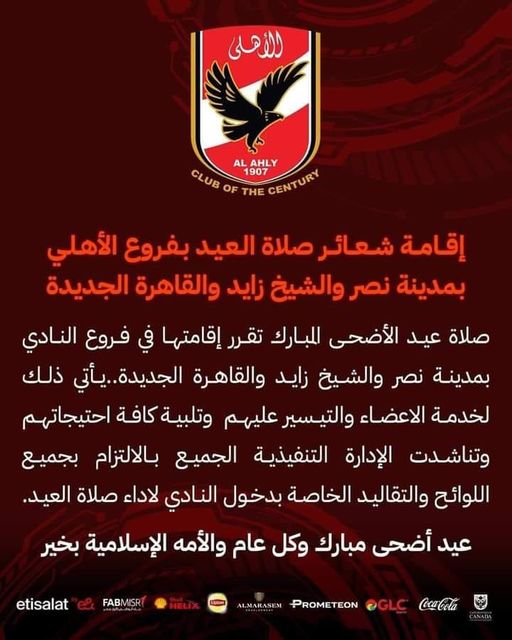 تقرر إقامة شعائر صلاة عيد الأضحى المبارك في فروع النادي الأهلي بمدينة نصر والشيخ زايد والقاهرة الجديدة.