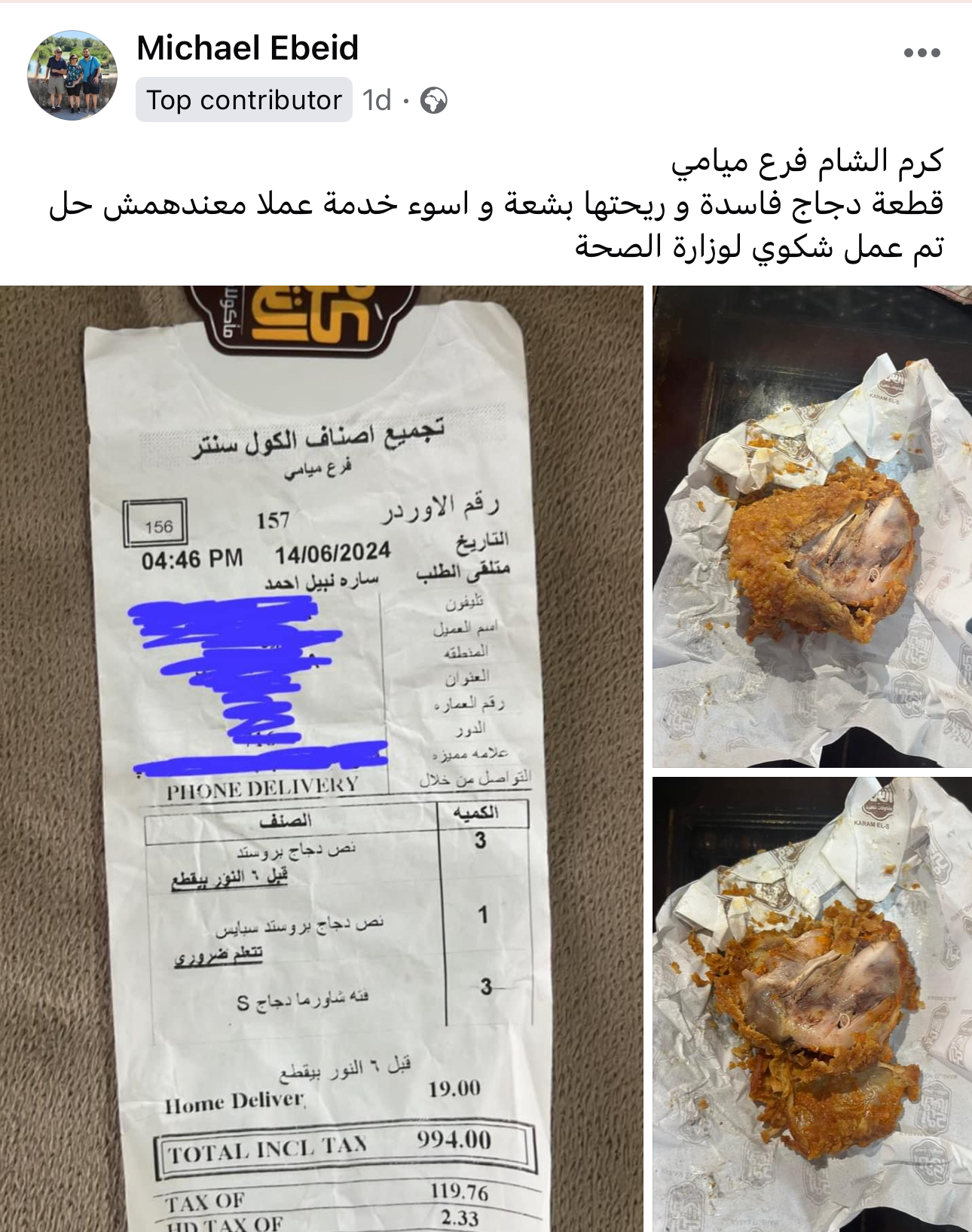 وقال صاحب الشكوى عبر السوشيال ميديا،" كرم الشام فرع ميامي قطعة دجاج فاسدة و ريحتها بشعة و اسوء خدمة عملا معندهمش حل وتم عمل شكوي لوزارة الصحة"