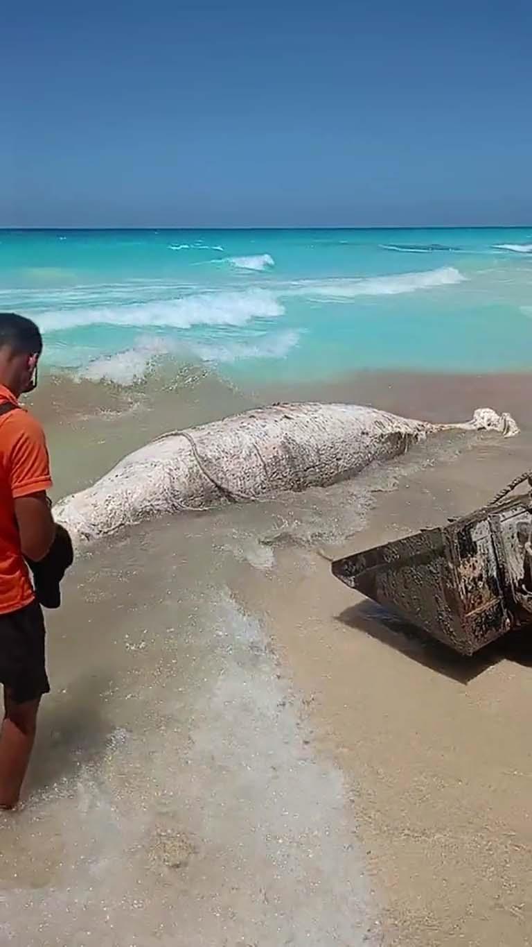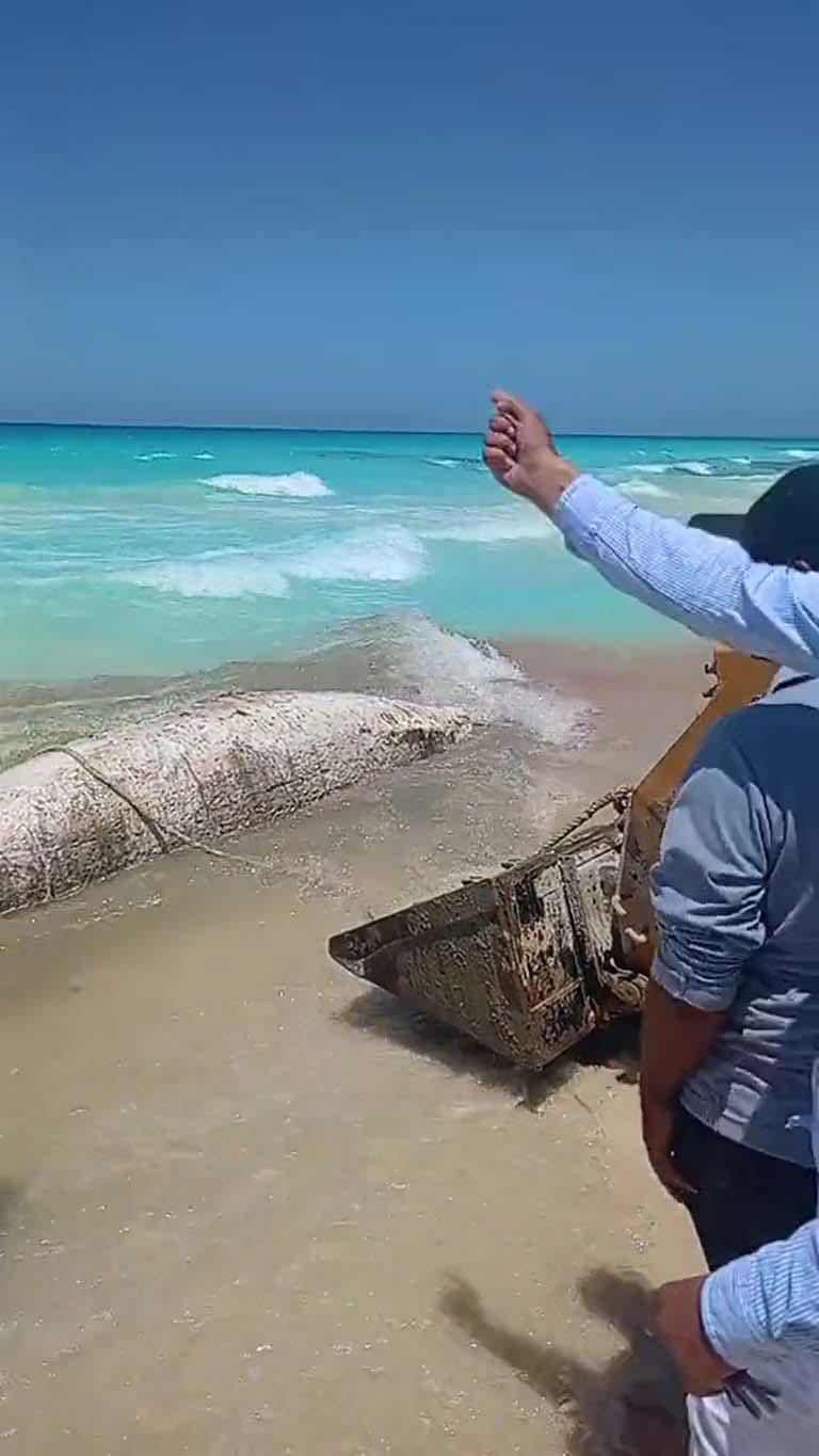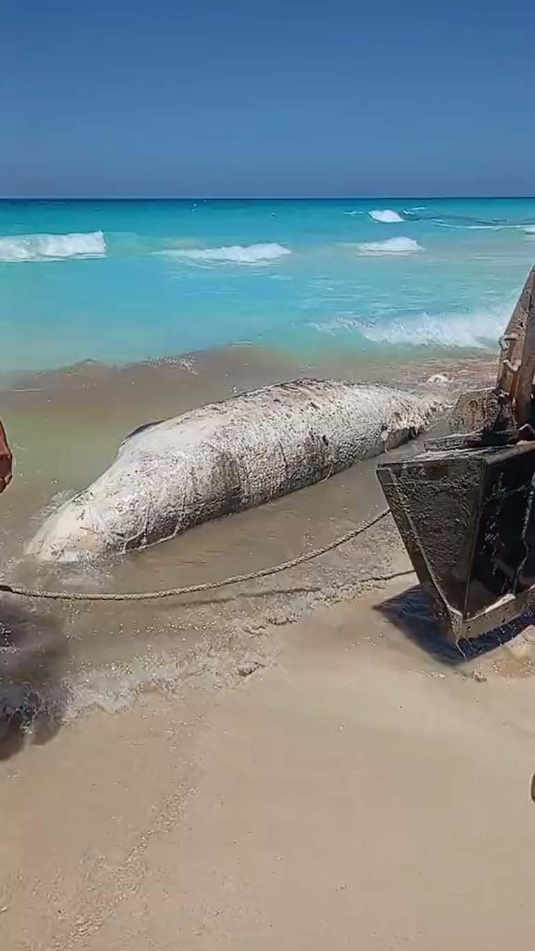 ويظهر في لقطات حصل عليها مصراوي، حوت نافق على أحد شواطئ الساحل الشمالي، فيما تقوم إحدى المعدات برفعه لنقله للمدفن الآمن تحت إشراف جهاز شؤون البيئة.