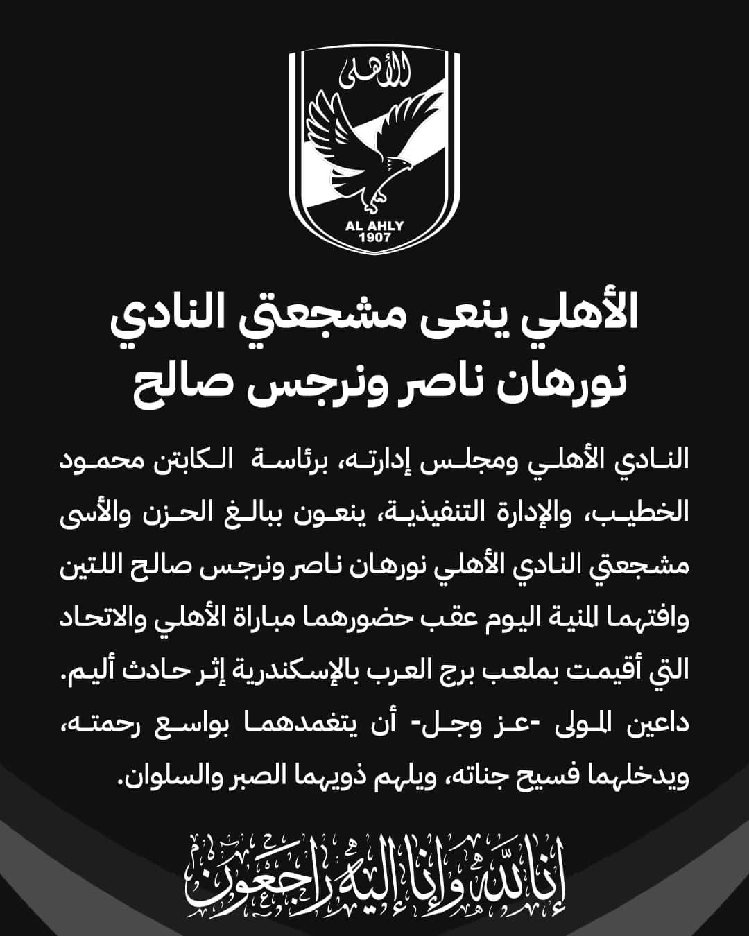 نعى النادى الأهلى مشجعتى النادى نورهان ناصر ونرجس صالح اللتين وافتهما المنية اليوم عقب حضورهما مبارتة الأهلى والاتحاد التى أقيمت بملعب برج العرب إثر حادث أليم.