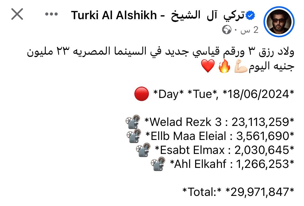 أعلن المستشار تركي آل الشيخ عبر منشور على صفحته الخاصة بموقع فيسبوك ، معلقا عليه “ولاد رزق 3” حقق رقم قياسي في السينما المصرية 23 مليون جنيه اليوم الأربعاء".