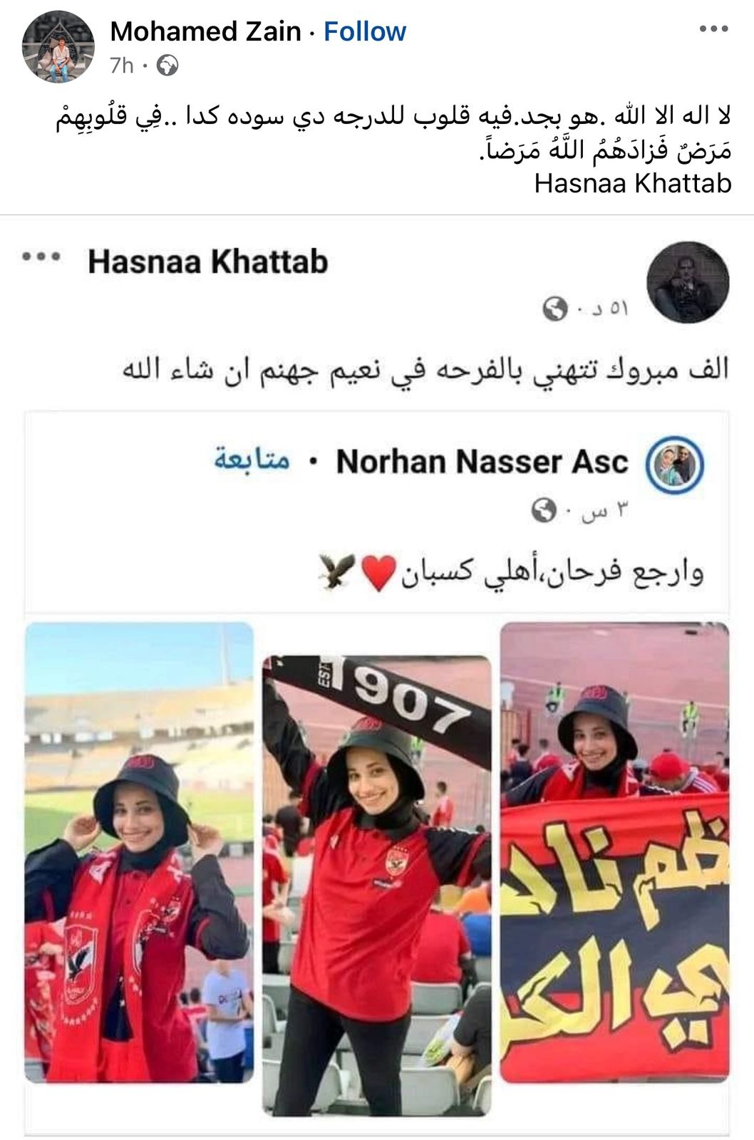 وشاركت فتاة من حساب بـ اسم حسناء خطاب، بأحد المنشورات على منصة التواصل الاجتماعي فيسبوك، معلقة على وفاة نورهان ناصر مشجعة الأهلي: ألف مبروك تتهني بالفرحة في نعيم جهنم إن شاء الله.