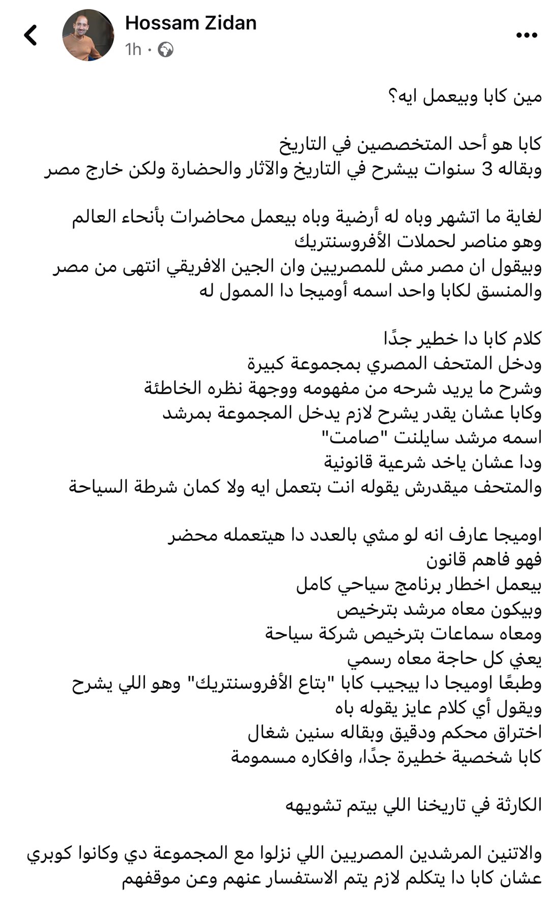 وقال،" وطبعًا اوميجا دا بيجيب كابا "بتاع الأفروسنتريك" وهو اللي يشرح ويقول أي كلام عايز يقوله باه اختراق محكم ودقيق وبقاله سنين شغال كابا شخصية خطيرة جدًا، وافكاره مسمومة الكارثة في تاريخنا اللي بيتم تشويهه والاتنين المرشدين المصريين اللي نزلوا مع المجموعة دي وكانوا كوبري عشان كابا دا يتكلم لازم يتم الاستفسار عنهم وعن موقفهم".
