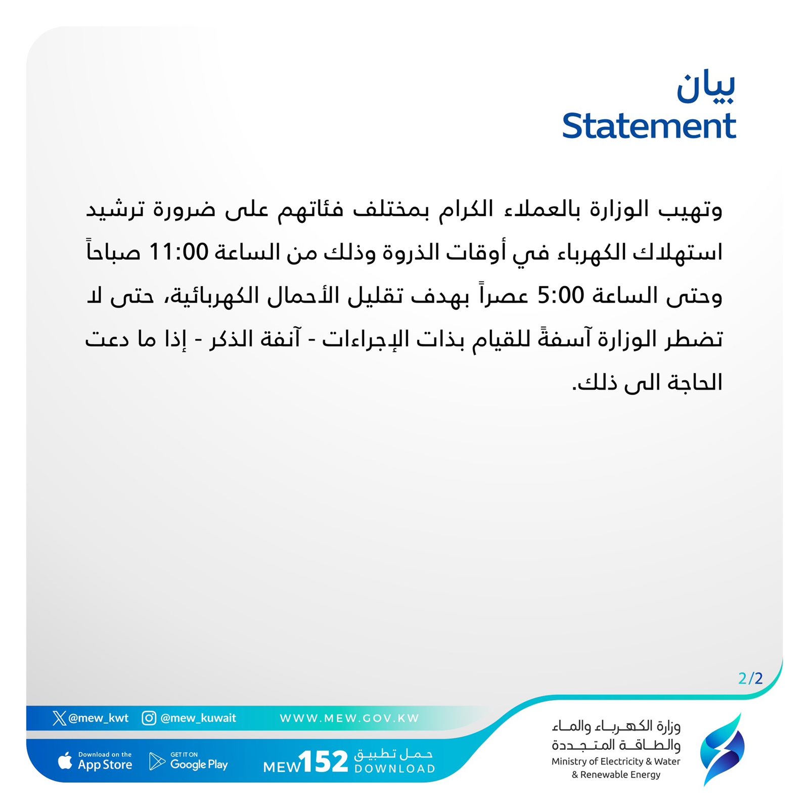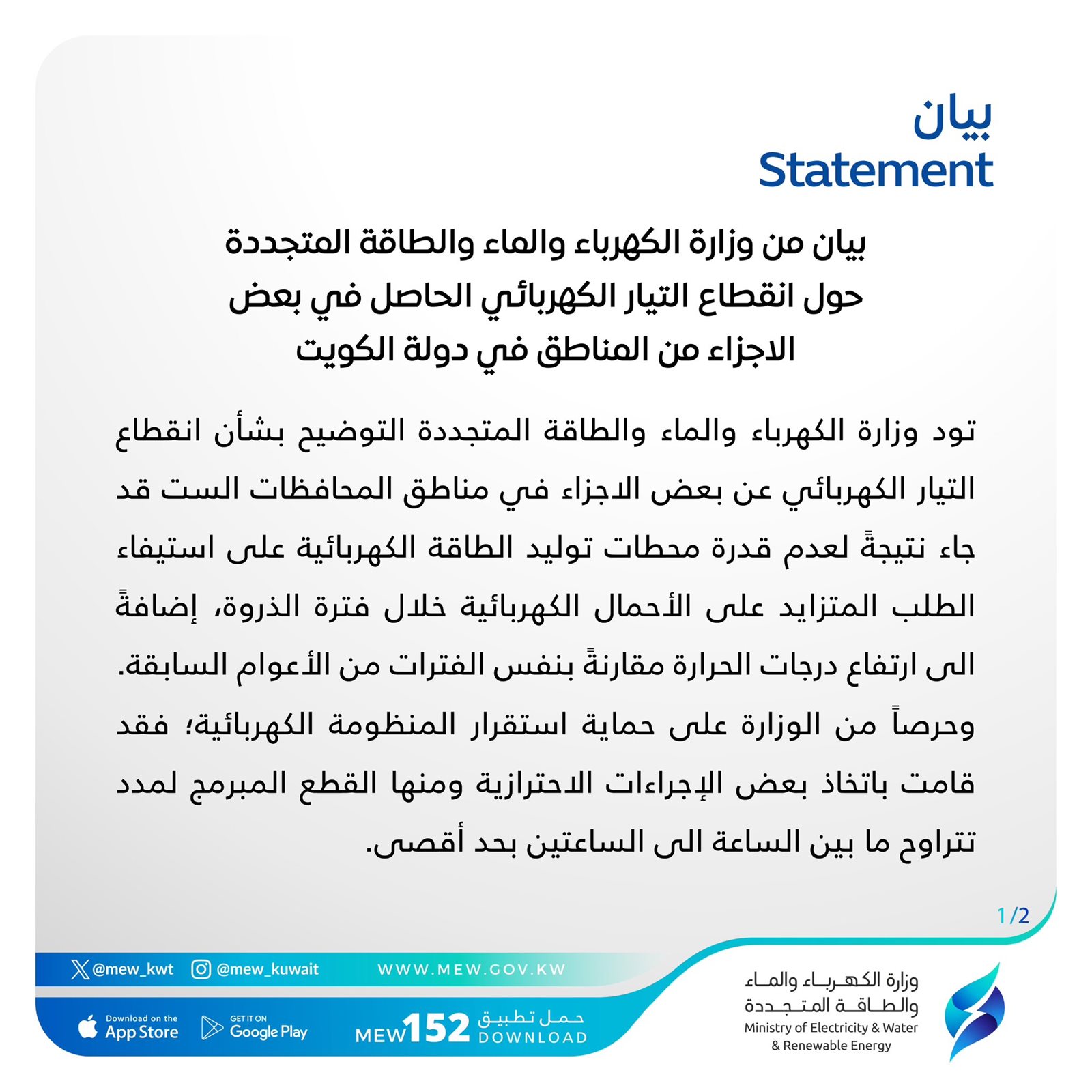 كشفت وزارة الكهرباء والماء في دولة الكويت عن انقطاع التيار الكهربائي عن بعض المناطق و 6 محافظات في الكويت، بسبب عدم قدرة محطات توليد الطاقة على استيفاء الطلب المتزايد على الاحمال الكهربائية خلال فترة الذروة، إضافة الى ارتفاع درجات الحرارة بنفس الفترات من الأعوام القادمة.