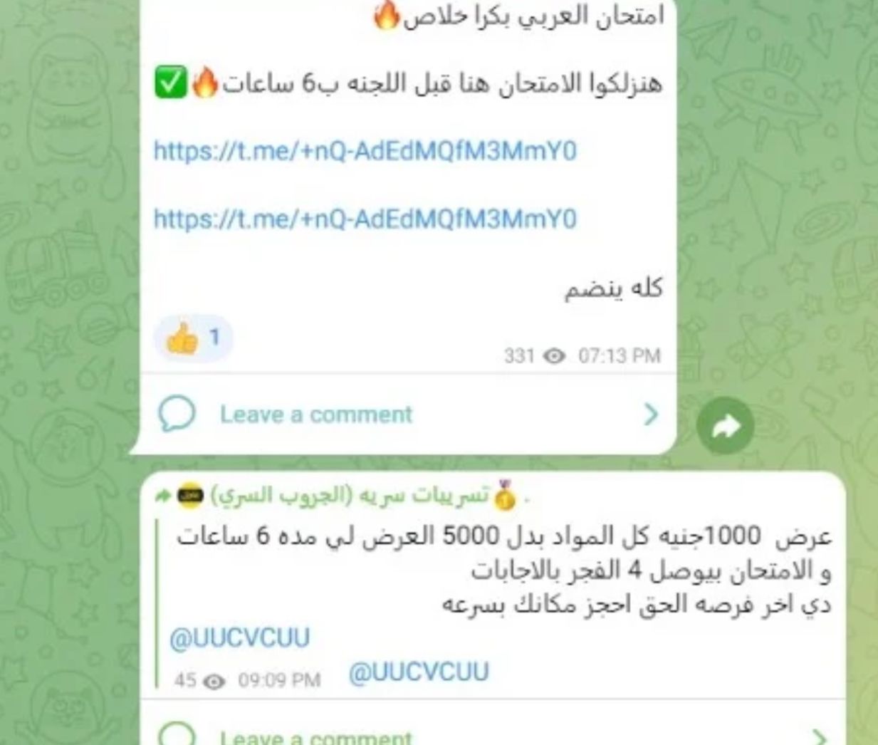 كتب أدمن شاومينج على جروب تليجرام، رسالة لطلاب الثانوية العامة 2024، قائلًا: هنزلكم امتحان اللغة العربية بكرة قبل اللجنة بـ6 ساعات، ويوجد عرض 1000 جنيه كل المواد بدل 5000، مشيرًا إلى أن العرض لمدة 6 ساعات فقط.