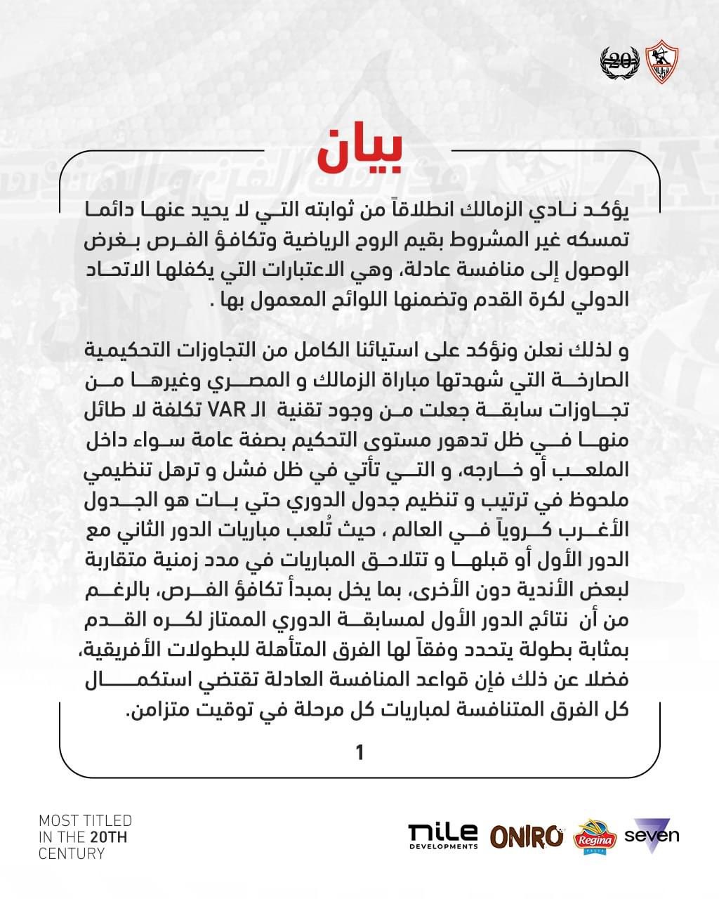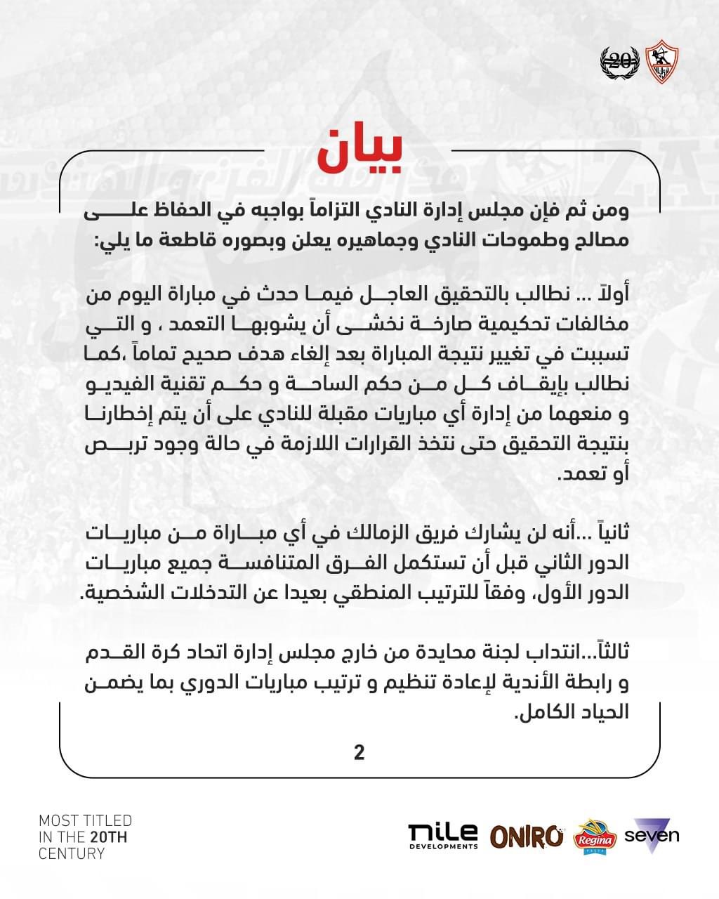 أولاً: نطالب بالتحقيق العاجل فيما حدث في مباراة اليوم من مخالفات تحكيمية صارخة نخشى أن يشوبها التعمد ، و التي تسببت في تغيير نتيجة المباراة بعد إلغاء هدف صحيح تماماً ،كما نطالب بإيقاف كل من حكم الساحة و حكم تقنية الفيديو و منعهما من إدارة أي مباريات مقبلة للنادي على أن يتم إخطارنا بنتيجة التحقيق حتى نتخذ القرارات اللازمة في حالة وجود تربص أو تعمد.