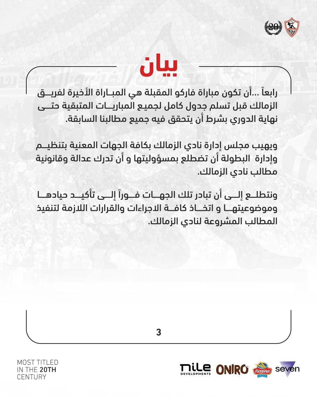 رابعا: أن تكون مباراة فاركو المقبلة هي المباراة الأخيرة لفريق الزمالك قبل تسلم جدول كامل لجميع المباريات المتبقية حتي نهاية الدوري بشرط أن يتحقق فيه جميع مطالبنا السابقة.