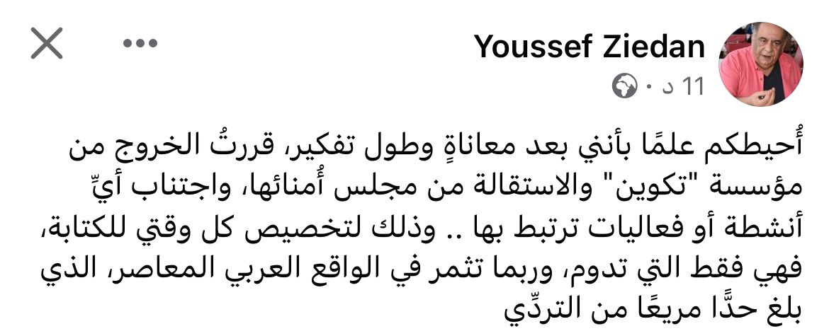 وقال في تدوينة له على صفحته على فيس بوك: أُحيطكم علمًا بأنني بعد معاناةٍ وطول تفكير، قررتُ الخروج من مؤسسة "تكوين" والاستقالة من مجلس أُمنائها، واجتناب أيِّ أنشطة أو فعاليات ترتبط بها .. وذلك لتخصيص كل وقتي للكتابة، فهي فقط التي تدوم، وربما تثمر في الواقع العربي المعاصر، الذي بلغ حدًّا مريعًا من التردِّي