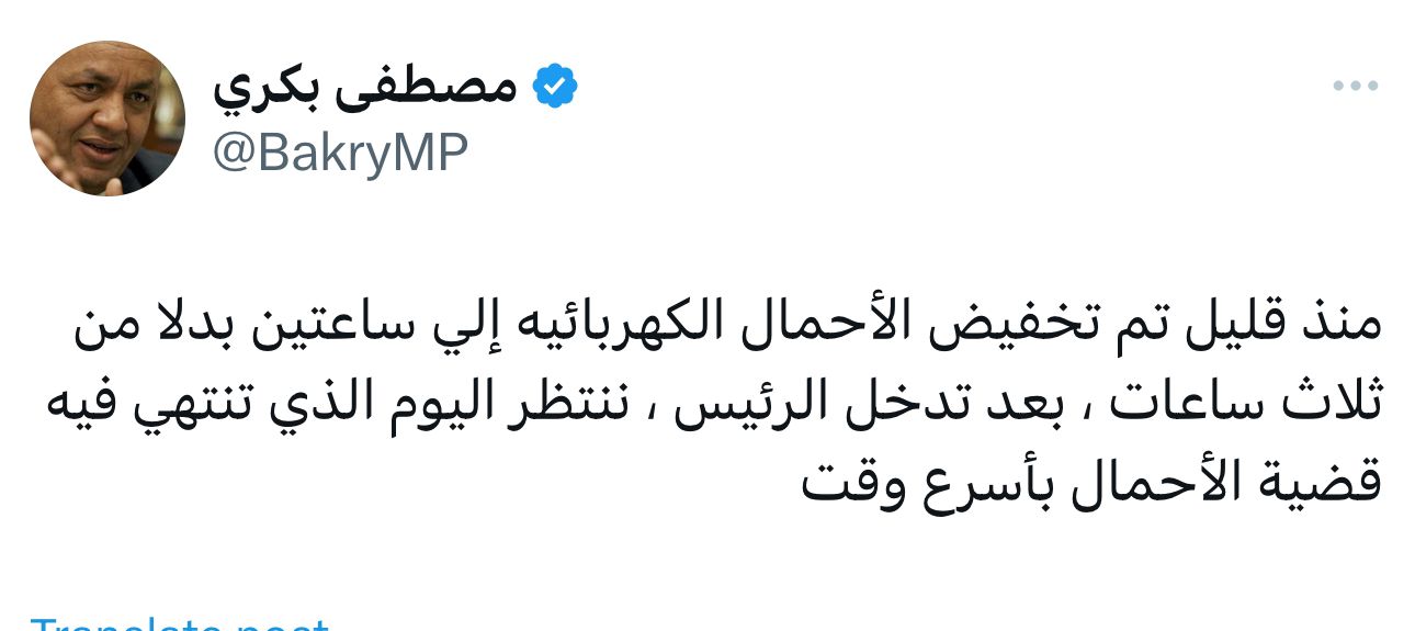 كشف النائب مصطفى بكرى عن تخفيض تخفيف أحمال الكهرباء لساعتين بدل 3 ساعات وذلك بعد تدخل الرئيس السيسي