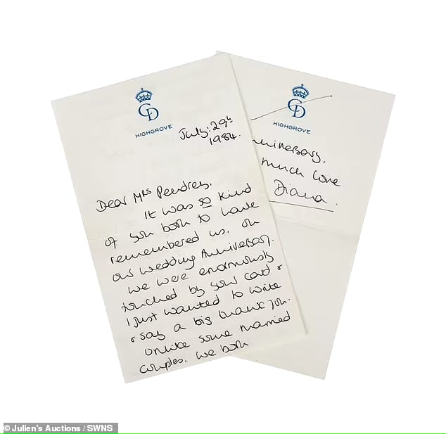 ولا يقتصر المزاد على قطع ديانا الراقية؛ كما يتم بيع رسائلها المكتوبة بخط اليد . جميع رسائلها موجهة إلى السيدة بندري، مديرة منزل سابقة ورسائل لزوجها الأمير تشارلز حينذاك.