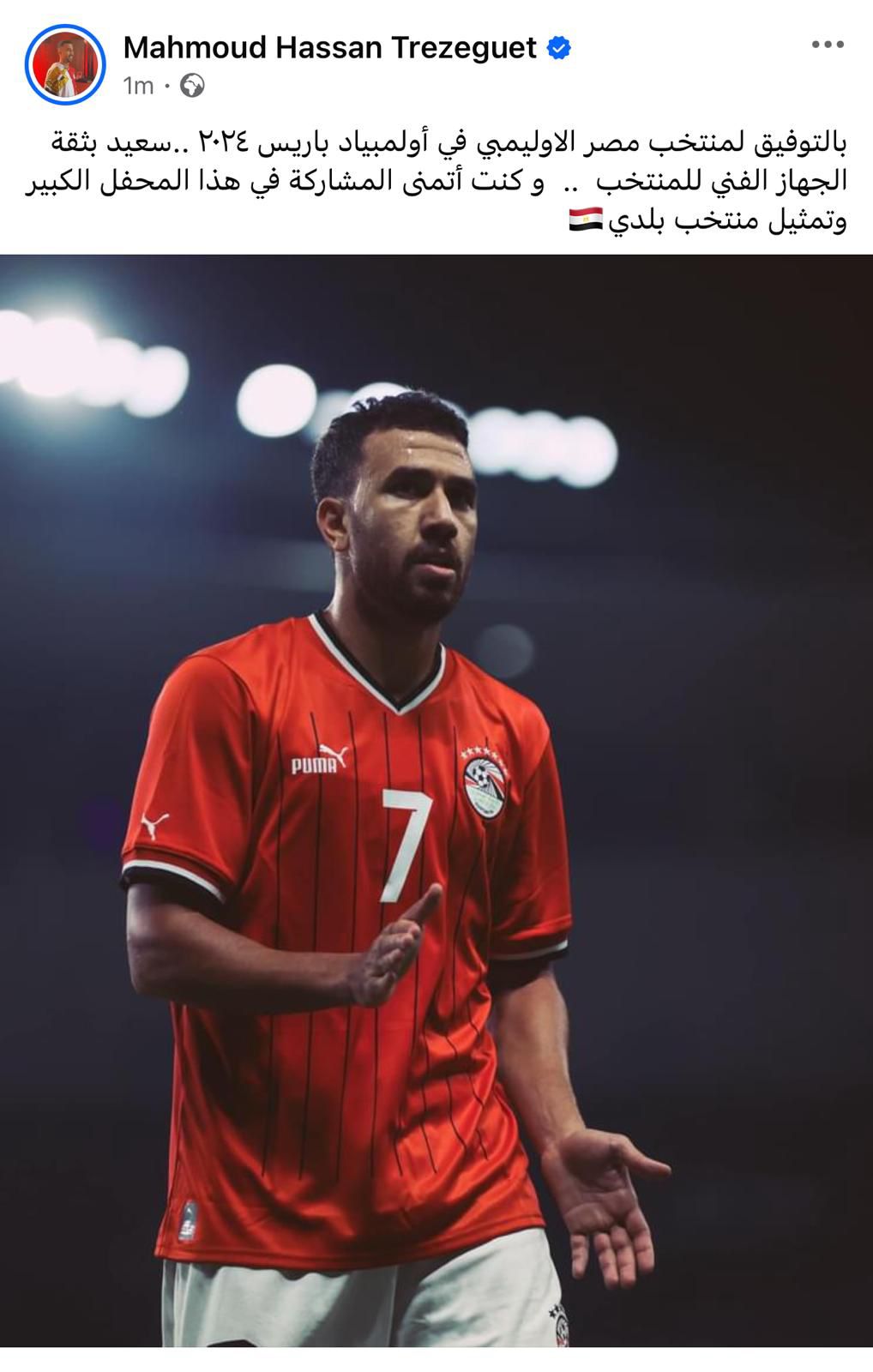 وقال تريزيجيه في تدوبنة له على موقع إكس: بالتوفيق لمنتخب مصر الاوليمبي في اولمبياد باريس 2024.. سيعد بثقة الجهاز الفني للمنتخب.. وكنت أتمنى المشاركة في المحفل الكبير وتمثيل منتخب بلدي"