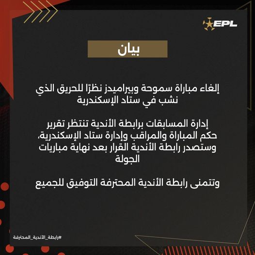 أصدرت رابطة الأندية المصرية المحترفة، بياناً رسمياً بشاأن مصير مباراة بيراميدز أمام سموحة، والتي ألغيت بسبب نشوب حريق في إستاد الأسكندرية.