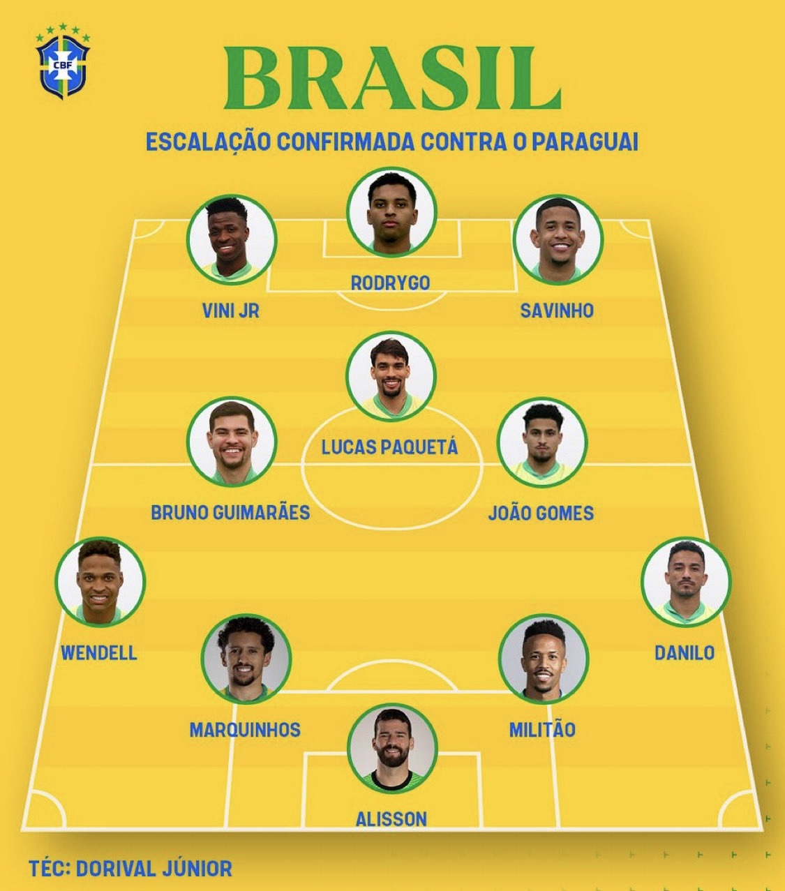 أعلن دوريفال جونيور، المدير الفني لمنتخب البرازيل، التشكيل الرسمي لسيليساو ضد منتخب باراجواي، في المباراة التى تجمعهما بعد قليل على ملعب أليجانت بمدينة لاس فيقاس في ولاية نيفادا، ضمن منافسات الجولة الثانية من بطولة كوبا أمريكا 2024، المقامة حاليًا فى الولايات المتحدة الأمريكية.