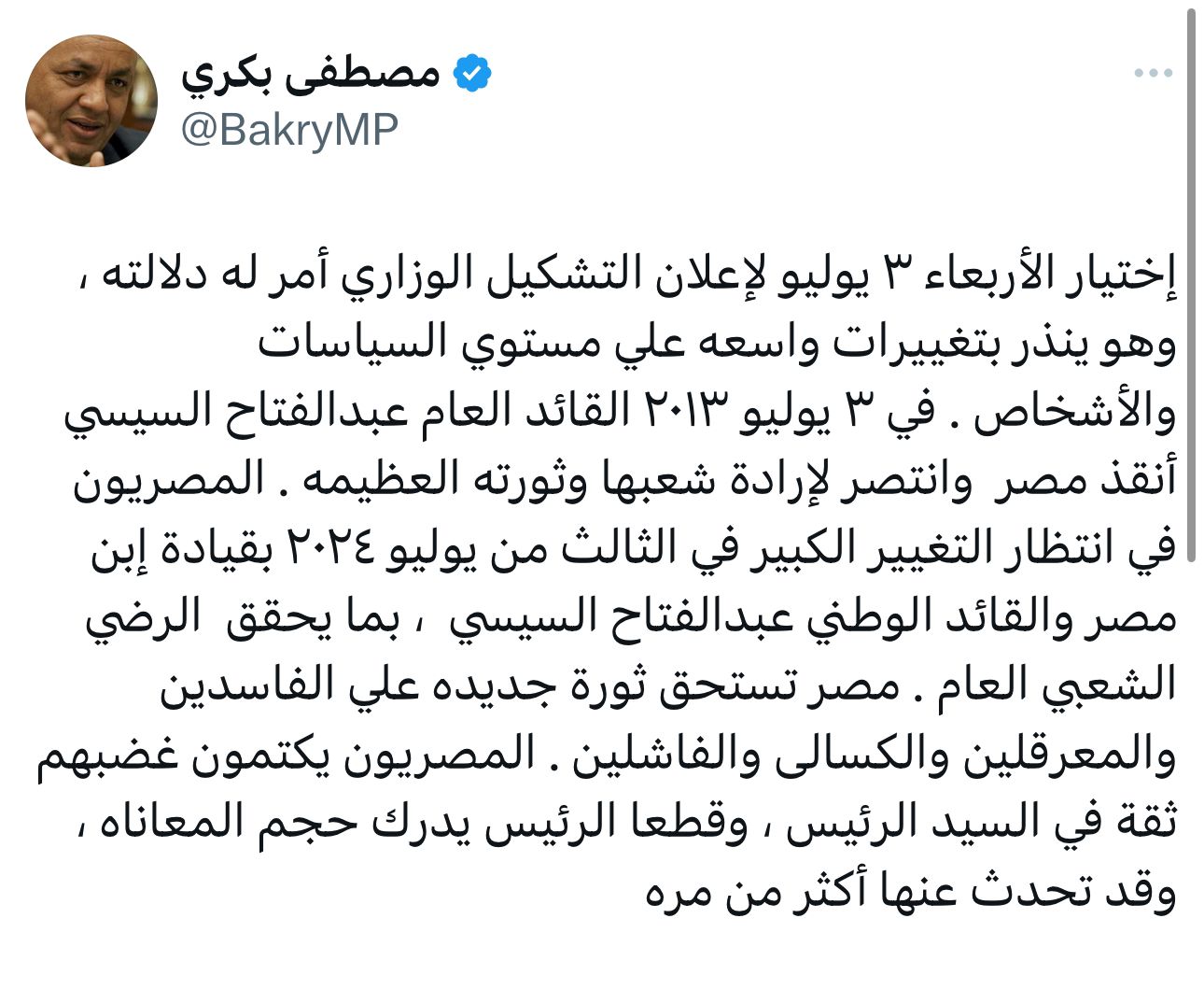 وأضاف “بكري”: “في ٣ يوليو ٢٠١٣ القائد العام عبدالفتاح السيسي أنقذ مصر وانتصر لإرادة شعبها وثورته العظيمه المصريون في انتظار التغيير الكبير في الثالث من يوليو ٢٠٢٤ بقيادة إبن مصر والقائد الوطني عبدالفتاح السيسي ، بما يحقق الرضي الشعبي العام”.