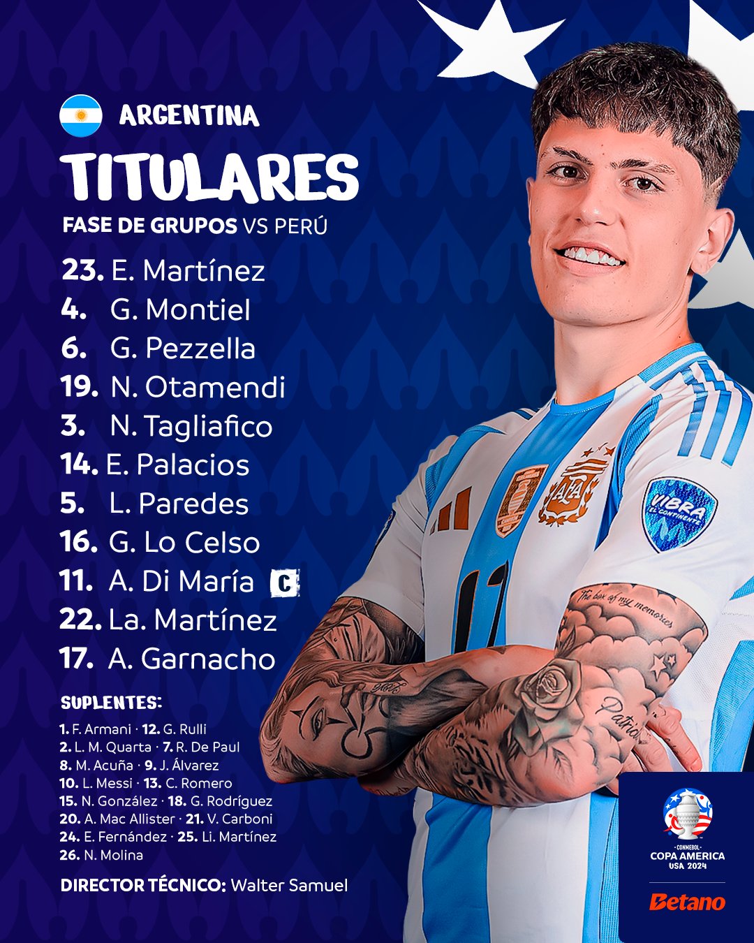 البدلاء: فرانكو أرماني، كوارتا، رودريجو دي بول، أكونيا، جوليان ألفاريز، ليونيل ميسي، رولي، كريستيان روميرو، نيكولاس جونزاليس، جايدو رودريجيز، ماك أليستر، كاربوني، إنزو فرنانديز، ليساندرو مارتينيز، مولينا.