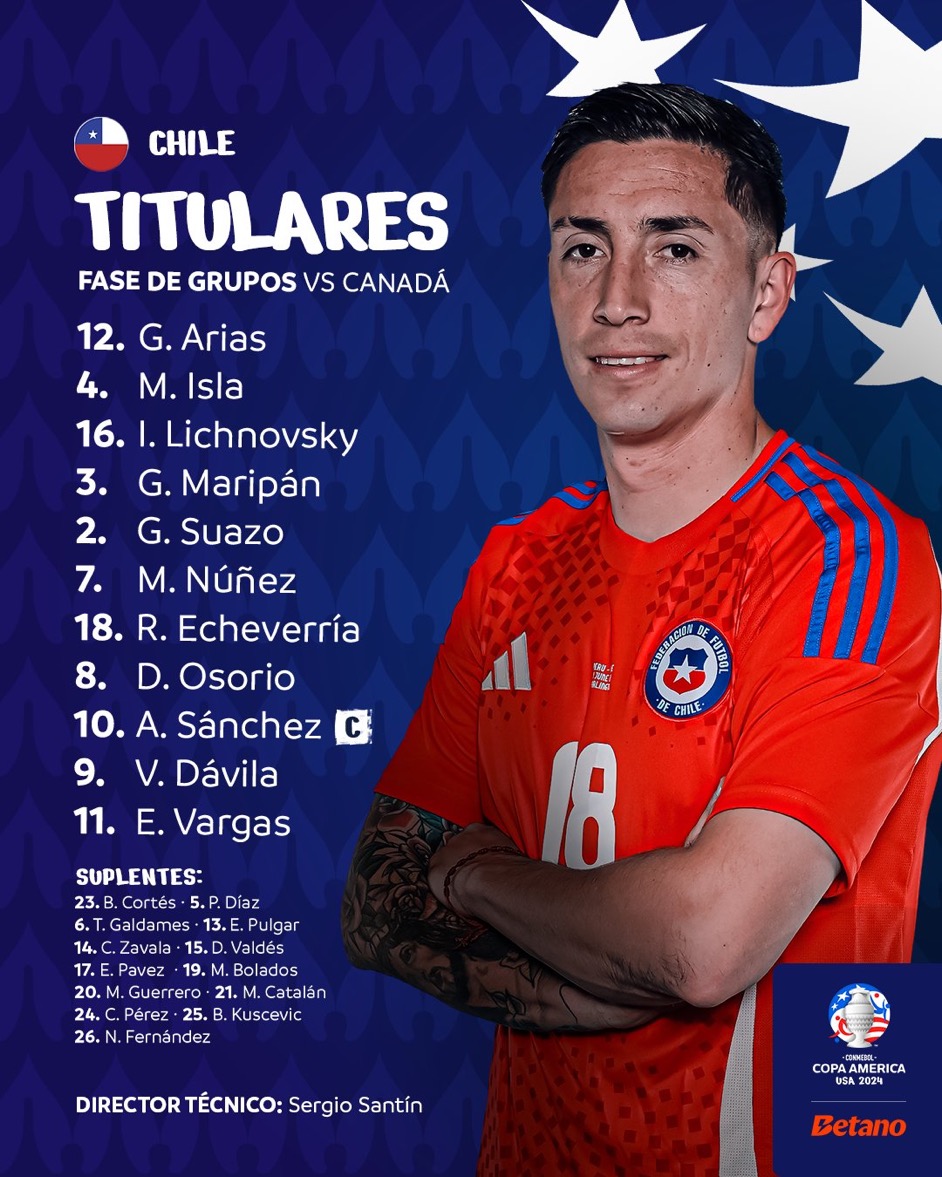 وأعلن ريكاردو جاريكا، المدير الفني لمنتخب تشيلي، عن التشكيل الرسمي الذي سيخوض مباراة كندا، على النحو التالي: