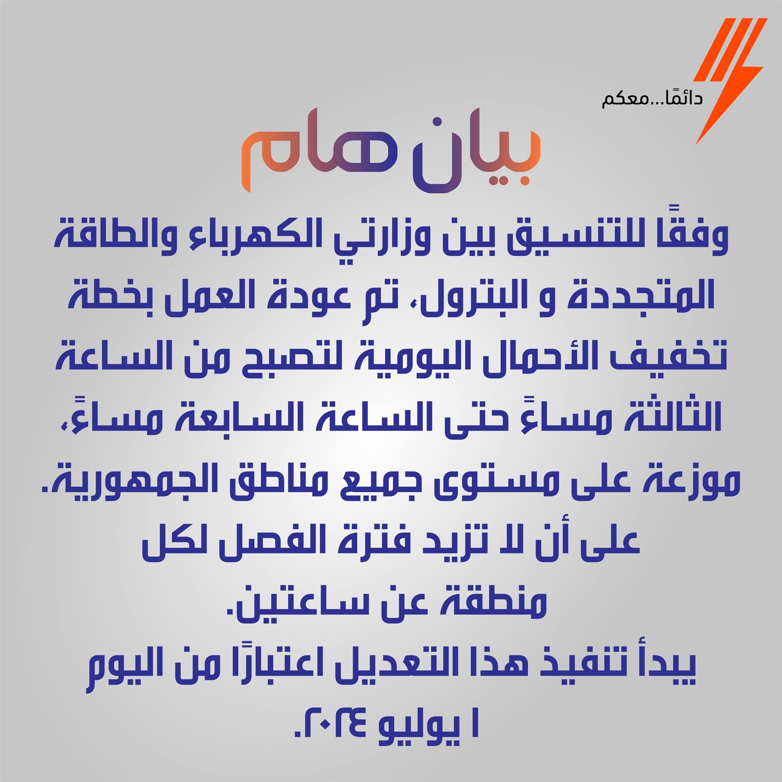 أعلنت الشركة القابضة للكهرباء ، إنه بالتنسيق بين وزارتى الكهرباء والبترول ، سيتم العودة للعمل بخطة تخفيف الأحمال لمدة ساعتين، لتصبح من الساعة الثالثة مساءاً وحتى السابعة مساءاً، موزعة على جميع مناطق الجمهورية