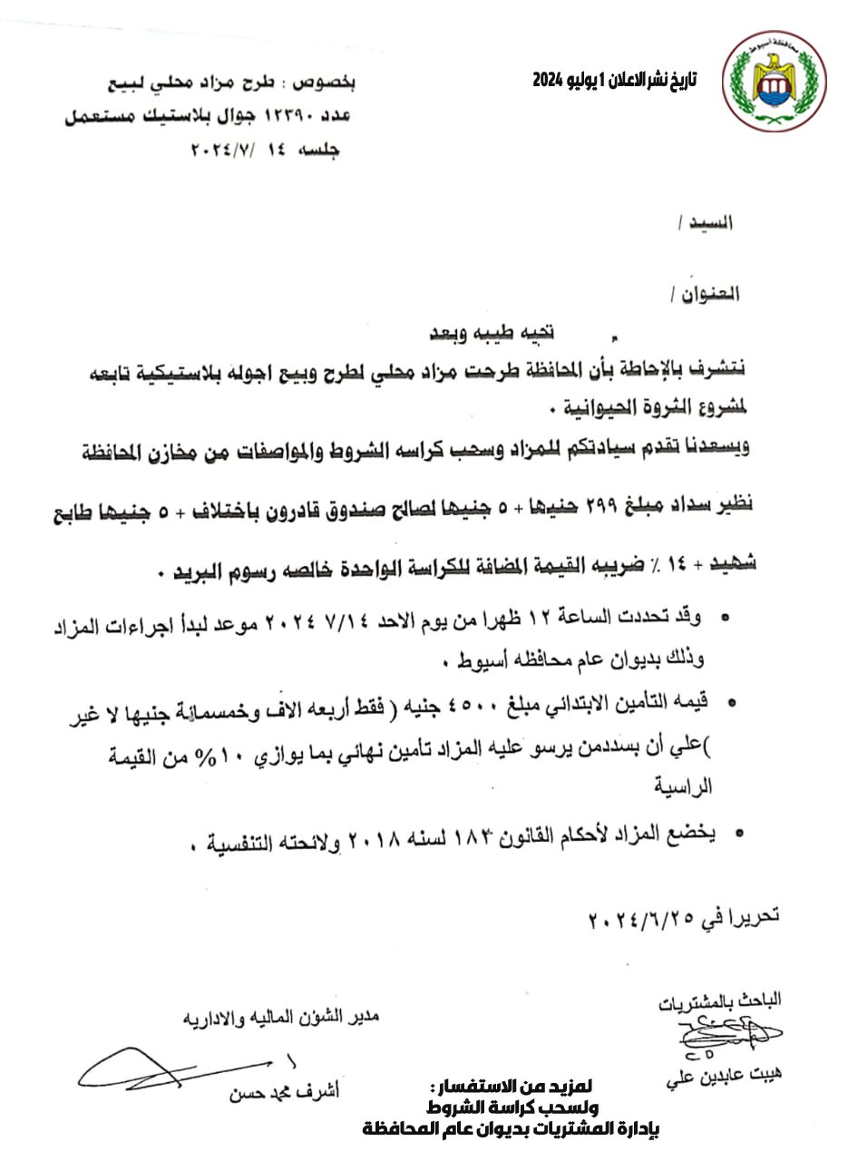 تعلن محافظة أسيوط "إدارة العقود والمشتريات" عن موافقة اللواء عصام سعد محافظ أسيوط على طرح مزاد محلى لبيع اجولة بلاستيكية عدد 12 الف و390 جوال تابعة لمشروع الثروة الحيوانية .