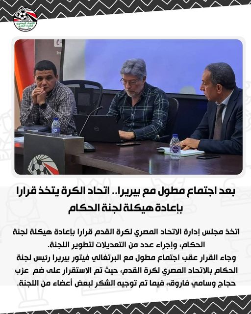 وجاء القرار بعد اجتماع مطول مع البرتغالي فيتور بيريرا رئيس لجنة الحكام بالاتحاد المصري لكرة القدم، وتم الاستقرار على ضم عزب حجاج وسامي فاروق، فيما تم توجيه الشكر لبعض أعضاء من اللجنة.