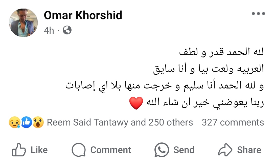 وكتب عمر خورشيد في منشوره الذي يرصده موقع تحيا مصر: لله الحمد قدر و لطف، العربية ولعت بيا و أنا سايق، ولله الحمد أنا سليم و خرجت منها بلا أي إصابات، ربنا يعوضني خير ان شاء الله.