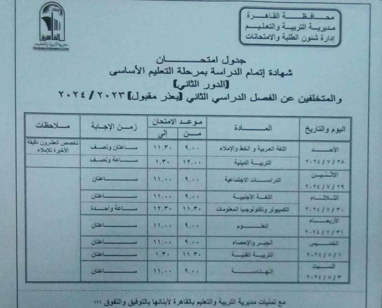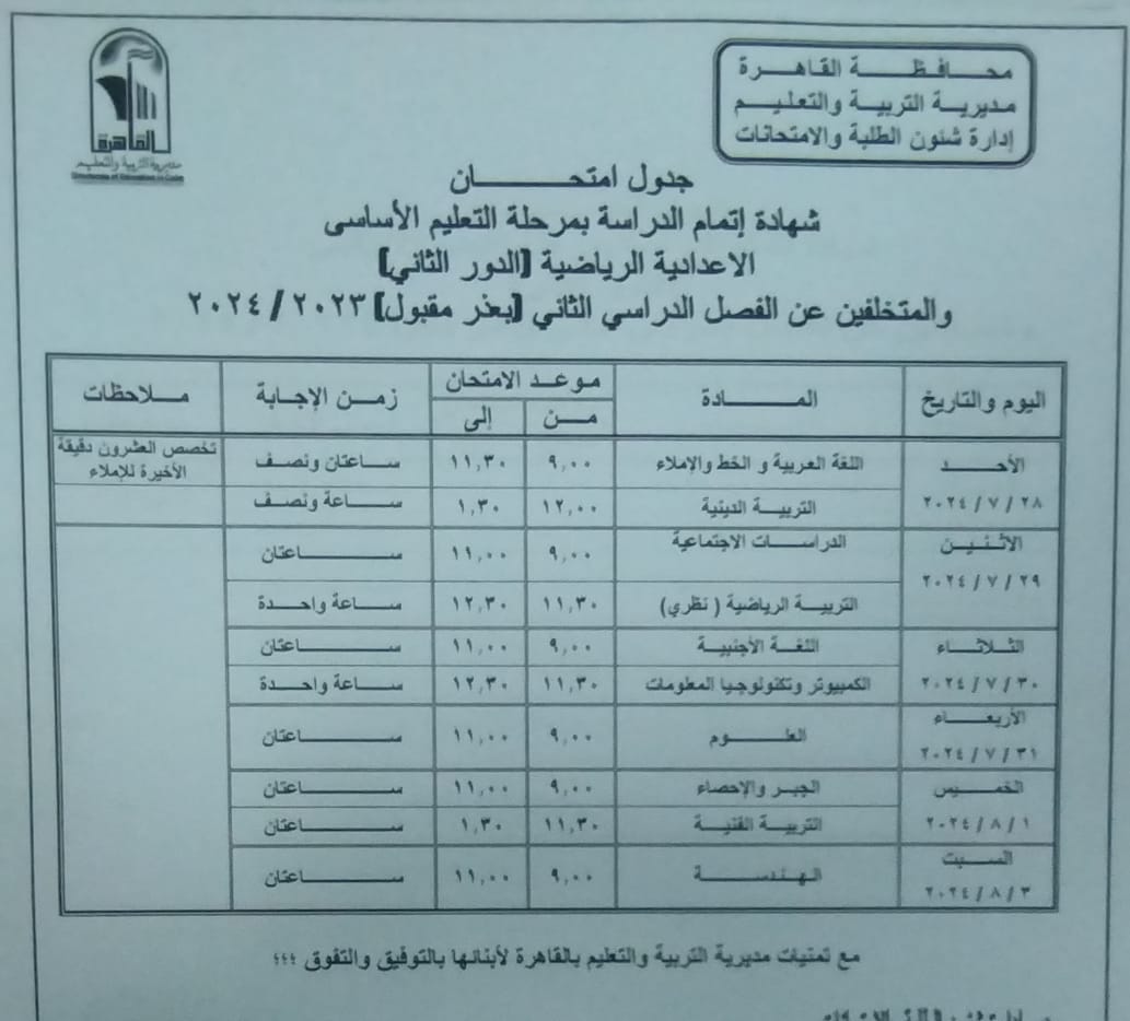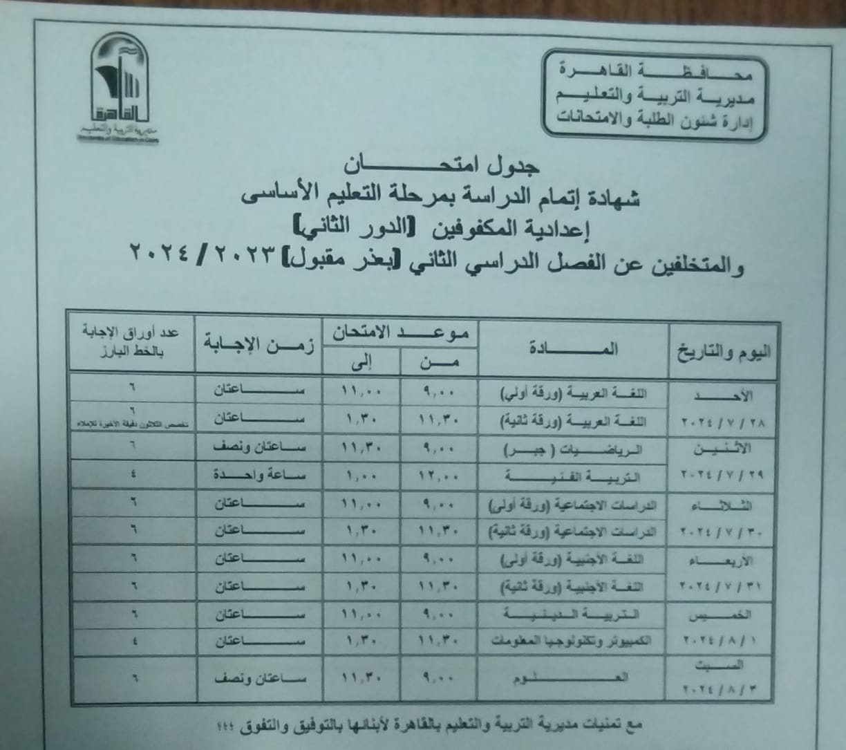 اعتمد د. إبراهيم صابر محافظ القاهرة جدول امتحانات الدور الثاني للعام الدراسي 2023/2024 حيث تُجرى الامتحانات خلال الفترة من 22 يوليو حتى 3 أغسطس 2024.