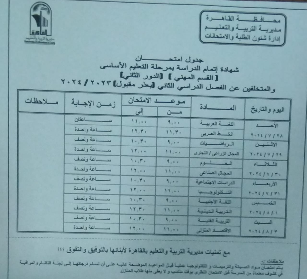 محافظ القاهرة يعتمد جدول امتحانات الدور الثاني للعام الدراسي