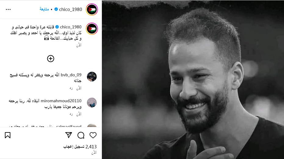 وكتب شيكو "قابلته مرة واحدة في حياتي وكان لذيذ أوى .. الله يرحمك يا أحمد ويصبر أهلك وكل حبايبك ..الفاتحة"