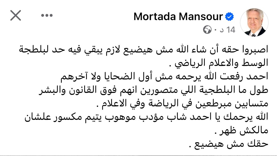 واختتم مرتضى منصور حديثة: “الله يرحمك يا احمد شاب مؤدب موهوب يتيم مكسور علشان مالكش ظهر، حقك مش هيضيع”.