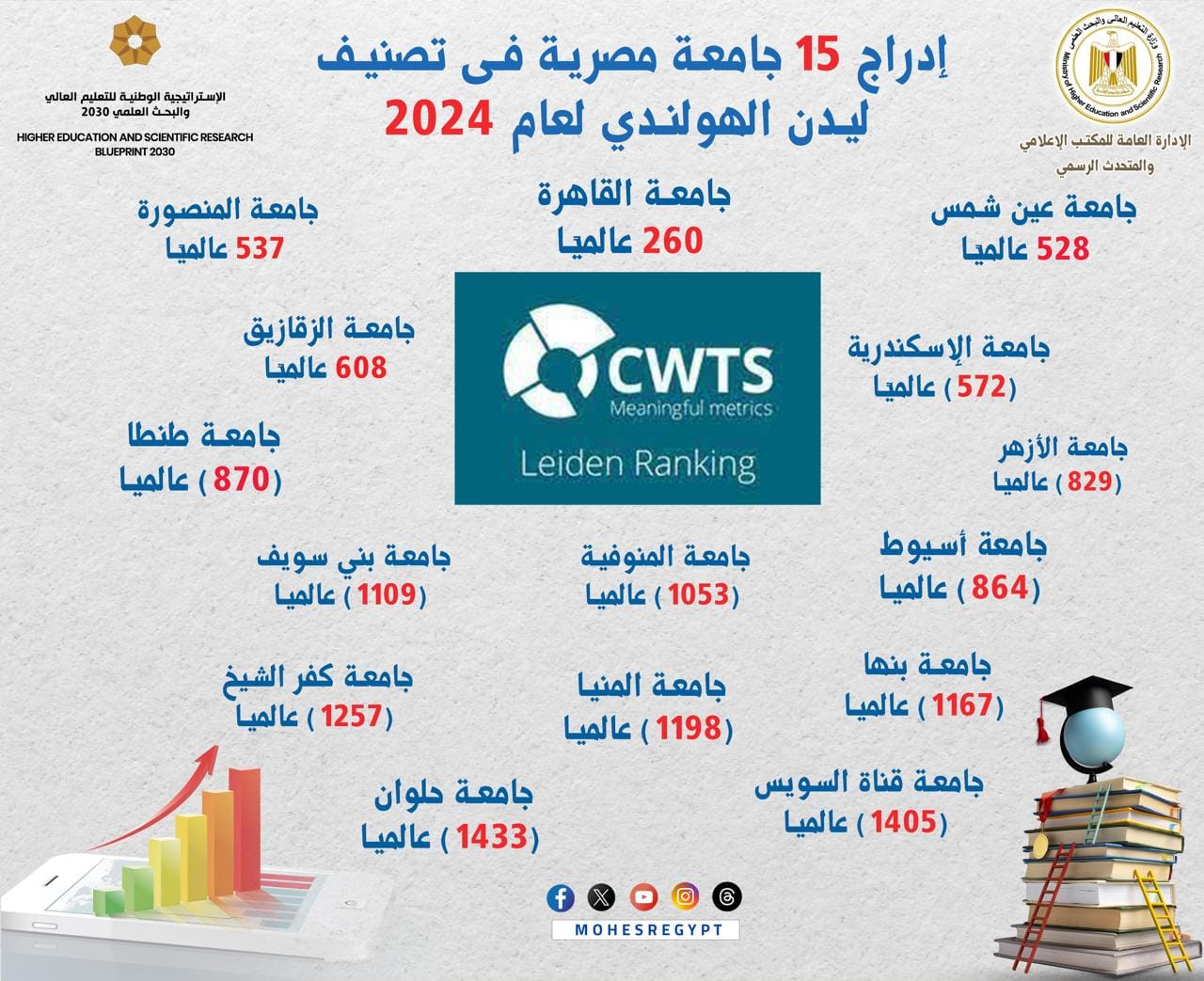 أعلن تصنيف ليدن Leiden الهولندي نتائج نسخته الجديدة لهذا العام 2024، والتي أظهرت إدراج 15 جامعة مصرية ضمن أفضل الجامعات الدولية المُدرجة بالتصنيف، وذلك بزيادة جامعتين مقارنة بالعام الماضى 2023 والذى شهد إدراج 13 جامعة مصرية بالتصنيف.