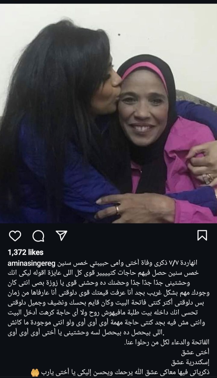 نشرت الفنانة والمطربة الشعبية أمينة صورة تجمعها بأختها وكتبت أمينة علي الصورة " النهاردة ٧/77 ذكرى وفاة أختي وأمي حببتي خمس سنين حصل حاجات كتير فيهم كل اللي عايزة اقولوا أنك وحشتيني جدا جدا وحضنك دة وحشني يا زوزة "