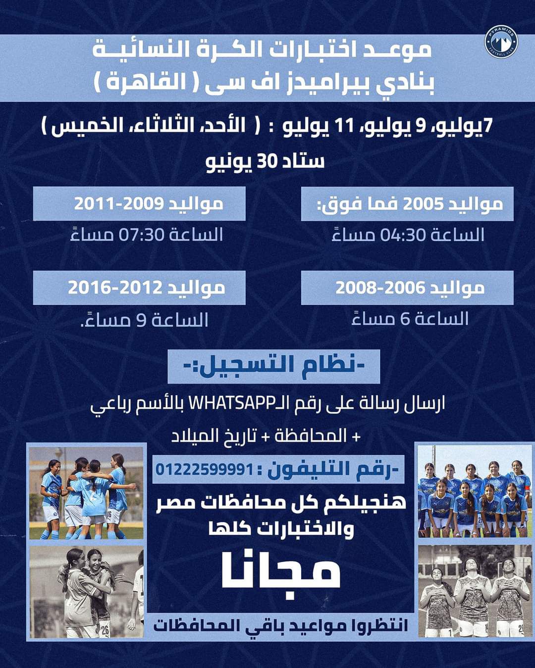 كشف نادي بيراميدز عن موعد اختبارات اللاعبات الجدد لقطاع الكرة النسائية بالنادي.