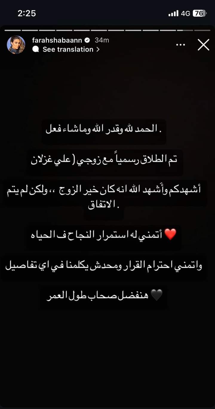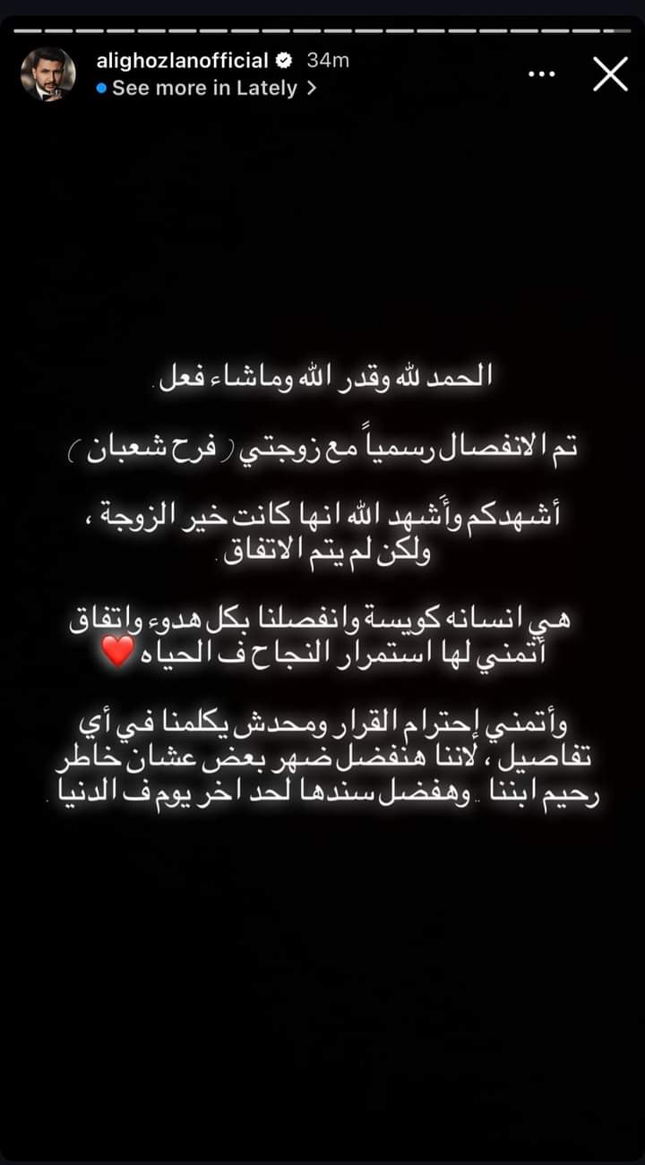 وكتب علي: "الحمد لله وقدر الله وما شاء فعل تم الانفصال رسميا مع زوجتي فرح شعبان، أشهدكم واشهد الله إنها كانت خير زوجة ولكن لم يتم الاتفاق، هي إنسانة كويسة وانفصلنا بكل هدوء واتفاق".