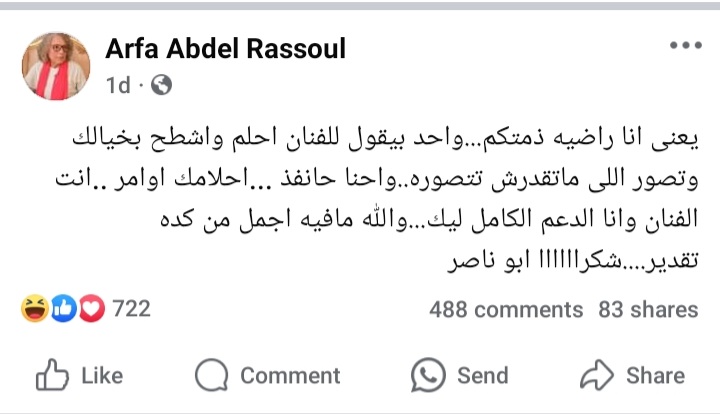 وجهت الفنانة عارفة عبد الرسول رسالة شكر عبر صفحتها الرسمية لتركي آل الشيخ رئيس هيئة الترفية بالمملكة العربية السعودية ، وكتبت عارفة " يعنى انا راضيه ذمتكم...واحد بيقول للفنان احلم واشطح بخيالك وتصور اللى ماتقدرش تتصوره..واحنا حانفذ ...احلامك اوامر ..انت الفنان وانا الدعم الكامل ليك...والله مافيه اجمل من كده تقدير....شكراااااا ابو ناصر "