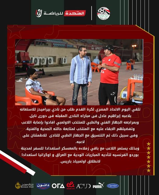وجاء في ختام البيان "وبذلك يستمر اللاعب مع باقي زملاءه بالمعسكر استعدادا للسفر لمدينة بوردو الفرنسيه لتأديه المباريات الودية مع العراق و اوكرانيا استعدادا لانطلاق اولمبياد باريس. تلقي اليوم الاتحاد المصري لكرة القدم طلب من نادي بيراميدز للاستعانه بلاعبه إبراهيم عادل فى مباراه النادى المقبله فى دورى نايل."