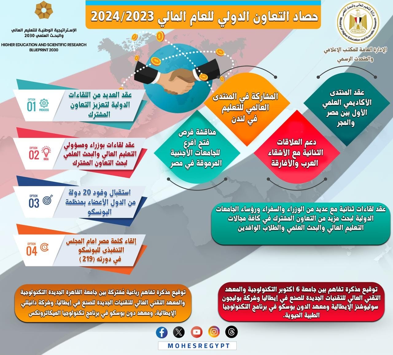 شهد العام المالي 2023/2024 اهتمامًا مُكثفًا من جانب وزارة التعليم العالي والبحث العلمي بالتعاون الدولي؛ حرصًا على تطبيق مبدأ المرجعية الدولية ضمن الإستراتيجية الوطنية التي أطلقتها الوزارة، ودعمًا لجهود تطوير المنظومة التعليمية والبحثية المصرية لتُضاهي نظيراتها من المؤسسات الدولية ذات المكانة المرموقة في مجال التعليم العالي والبحث العلمي.