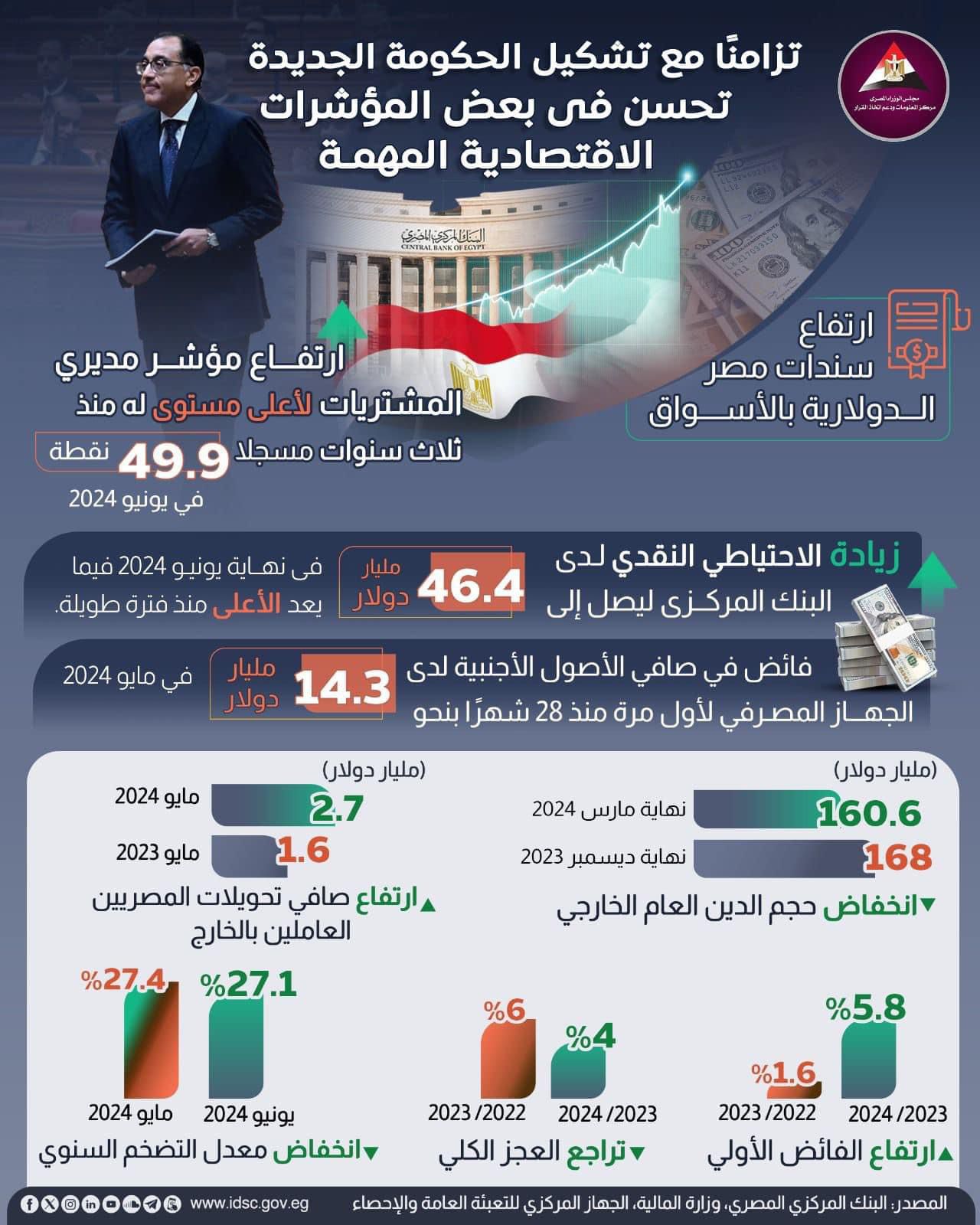كشف المركز الإعلامى لمجلس الوزراء، إنه تزامناً مع تشكيل الحكومة الجديدة، حدث تحسن فى بعض المؤشرات الاقتصادية المهمة.