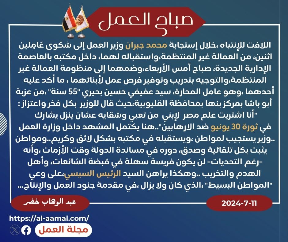 وقالت الوزارة في بيان لها، "هنا يكتمل المشهد داخل وزارة العمل .. وزير يستجيب لمواطن ، ويستقبله في مكتبه بشكل لائق وكريم.. ومواطن يثبت بكل تلقائية وصدق، دوره في مساندة الدولة وقت الأزمات ،وأنه -رغم التحديات- لن يكون فريسة سهلة في قبضة الشائعات، وأهل الهدم والتخريب ..وهكذا يراهن الرئيس السيسي، على وعي "المواطن البسيط" ،الذي كان ولا يزال ،في مقدمة جنود العمل والإنتاج".