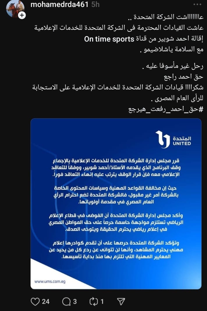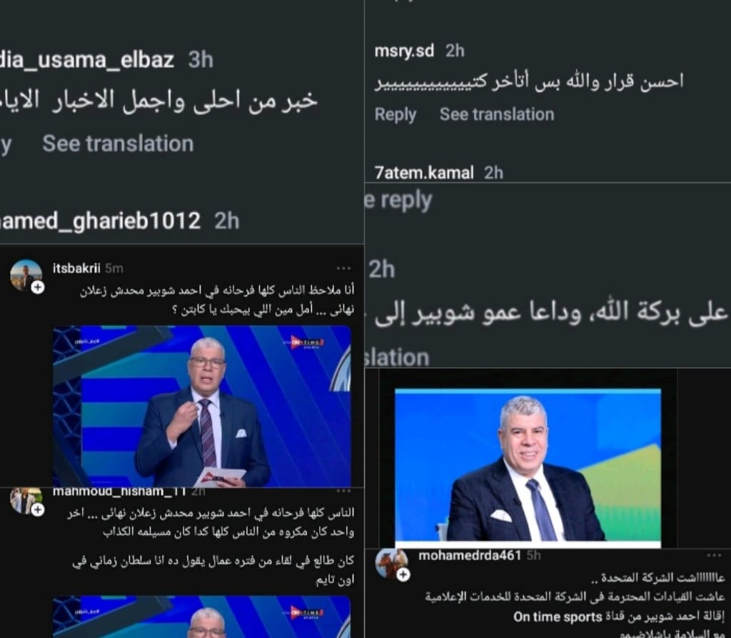 علق أحد متابعى السوشيال ميديا " علي بركة الله وداعا عمو شوبير ، وعلق آخر كل الدعم للمتحدة وتابع آخرون " خبر من أحلي وأجمل الاخبار الايام دى "