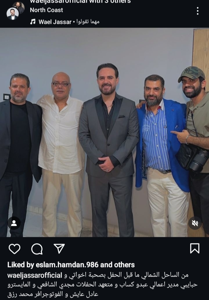 شارك النجم وائل جسار عبر صفحته الرسمية " أنستجرام " صورة تجمعه بمجموعة من أصدقائه قبل حفله اليوم بالساحل الشمالي وعلق عليها " من الساحل الشمالي ما قبل الحفل بصحبة أخواتي وحبايبي ومدير أعمالي عبده كساب ومتعهد الحفلات مجدى الشافعي والمايسترو عبده عايش والفوتجرافر محد رزق "