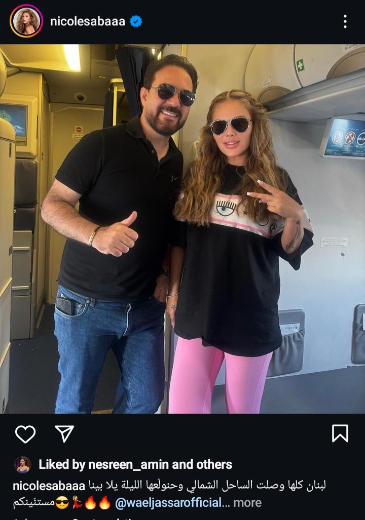 أيضآ نشرت الفنانة " نيكول سابا صورة تجمعها بوائل جسار من داخل الطيارة ، وكتبت "لبنان كلها وصلت الساحل الشمالي وحنولّعها الليلة يلا بينا مستنّينكم"