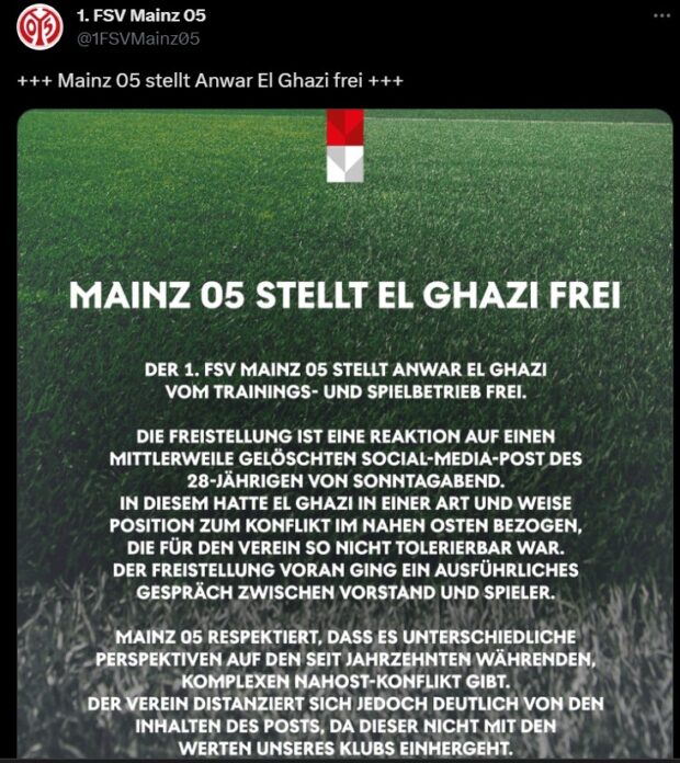 وقررت إدارة ماينز الألماني، في بيان رسمي، في نوفمبر 2023، فسخ تعاقد اللاعب الهولندي أنور الغازي، بعد إعلانه على منصات التواصل الإجتماعي دعم القضية الفلسطينية.