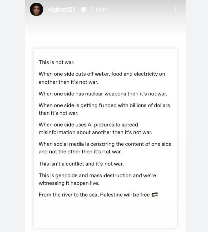 وقال أنور الغازي على صفحته الرسمية على إنستجرام، بعد الهجوم الإسرائيلي على غزة: “هذه ليست حربا، عندما يقطع طرفا المياه والطعام والكهرباء على طرف آخر فهذه ليست بالحرب، عندما يمتلك طرفا أسلحة نووية فهذه ليست بالحرب، عندما يتم تمويل طرفا بملايين الدولارات فهذه ليست بالحرب، عندما يستخدم طرفا صورا بالذكاء الاصطناعي لينشر معلومات مضللة فهذه ليست بالحرب، عندما تمنع مواقع التواصل الاجتماعي المحتوى من طرف واحد فقط فهذه ليست بالحرب”