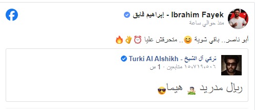 وكتب المستشار تركي أل الشيخ وزير هيئة الترفيه السعودية،عبى صفحته الرسمية عبر فيسبوك:" ريال مدريد، إبراهيم"، في إشاره منه لعمل يجمع بين الإعلامي إبراهيم فايق ونادي ريال مدريد الإسباني.